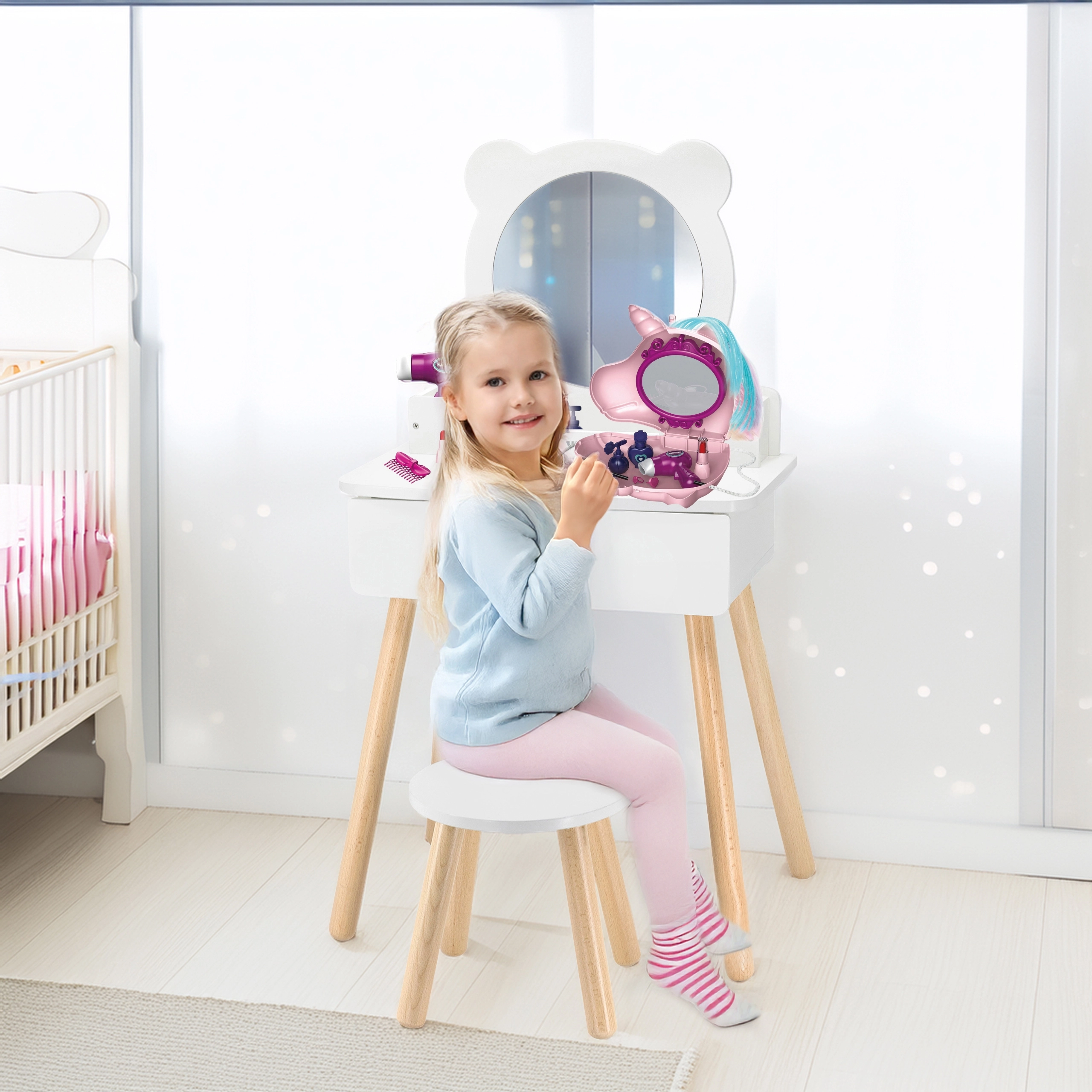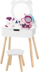 Eleganta măsuță de toaletă pentru copii din lemn masiv de la Viga, cu oglindă, sertar și scăunel stabil, este centrul perfect al oricărei camere de copil. Include și o geantă cu unicorn cu set de accesorii pentru joaca creativă de-a salonul de înfrumusețare. Măsuța are margini rotunjite sigure, este vopsită cu culori netoxice și oferă spații de depozitare ingenioase pentru mărunțișuri.