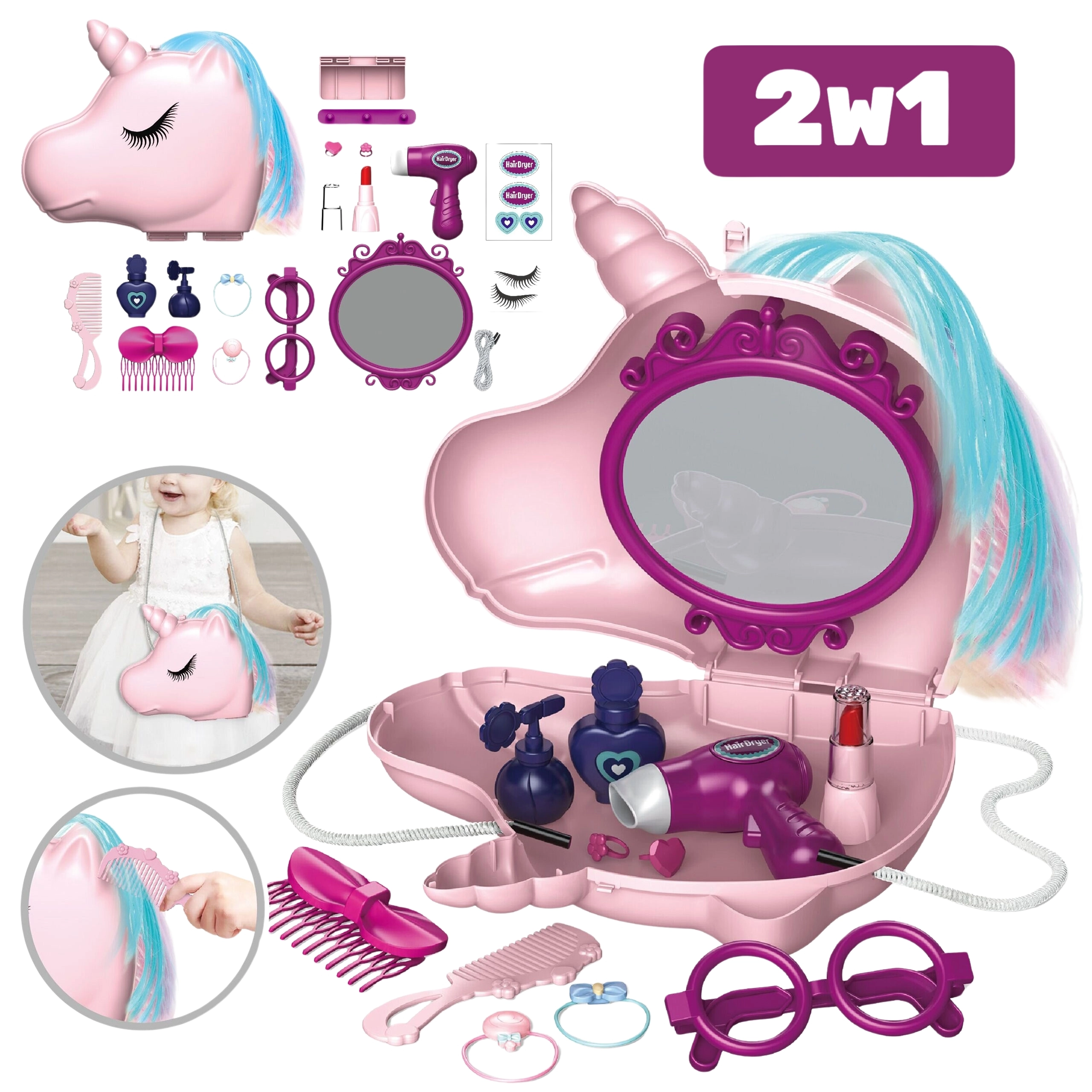 - geantă cu unicorn cu 19 accesorii (de ex. uscător care sufla aer, oglindă, piepteni, agrafe, „parfumuri”, ruj, inelușe etc.)