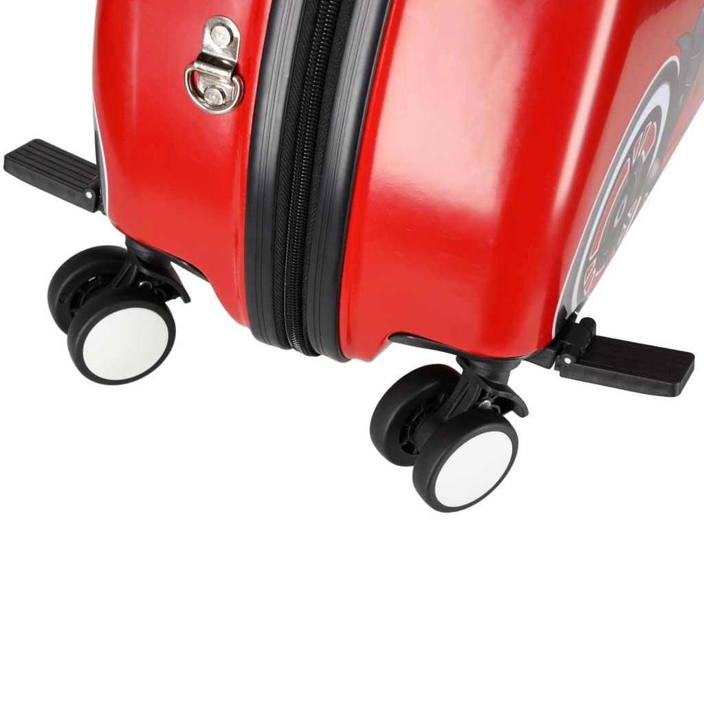 Trolerul pentru copii pe roți cu motiv de motocicletă transformă așteptarea în aeroport și călătoria într-o distracție. Copilul se poate așeza confortabil pe troler și poate fi tras, în timp ce colțurile-mânere frontale stabile sporesc priza sigură în timpul deplasării. Combinația inteligentă de două roți spate fixe și două roți față pivotante la 360° oferă stabilitate și manevrabilitate excelentă.