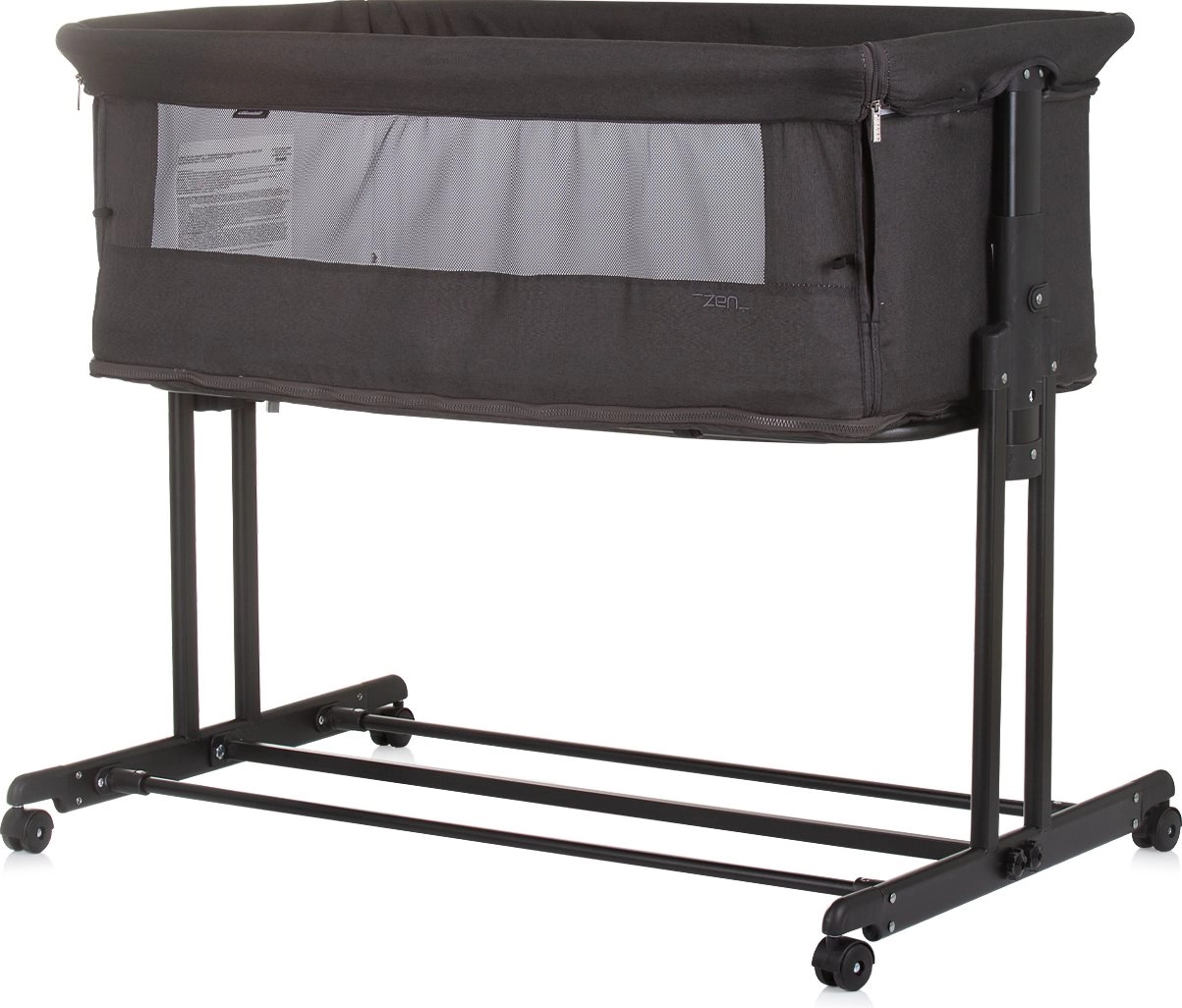 Pătuțul multifuncțional 3în1 CHIPOLINO Zen Obsidian servește ca pătuț pentru bebeluși, pătuț atașabil la pat și țarc de joacă. Oferă construcție ușoară și stabilă, reglaj pe înălțime în 4 poziții plus poziție anti-reflux, laterală rabatabilă pentru acces facil și roți cu frâne pentru mutare comodă. Include saltea moale cu husă din bumbac lavabilă și plasă anti-insecte. Respectă standardele EN 1130:2019 și EN 12227.