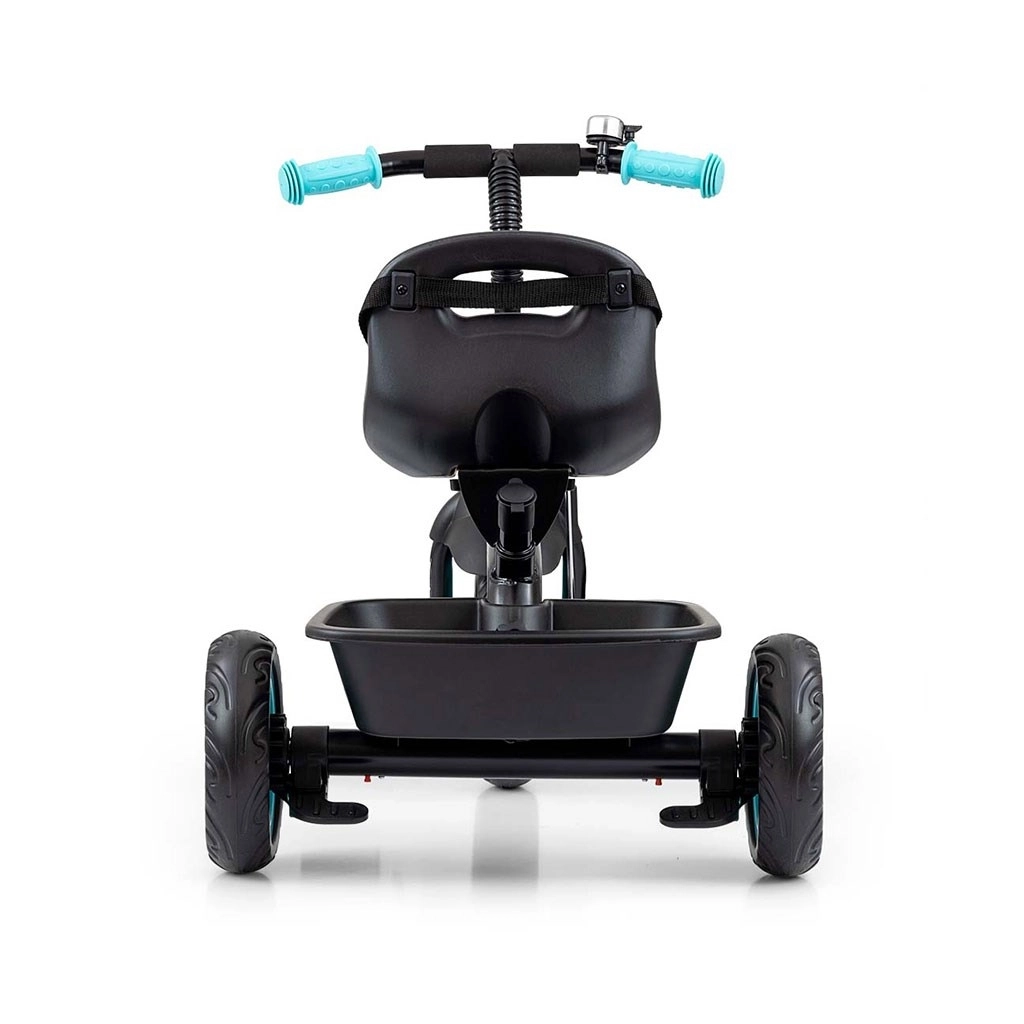 Centura în trei puncte cu protecții îl menține ferm pe micuț în șa, în timp ce coșulețul frontal și tăvița din spate oferă loc pentru jucării și mărunțișuri.