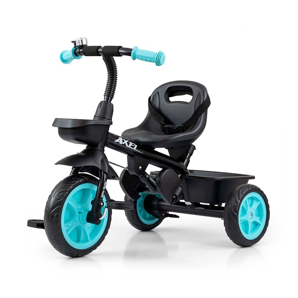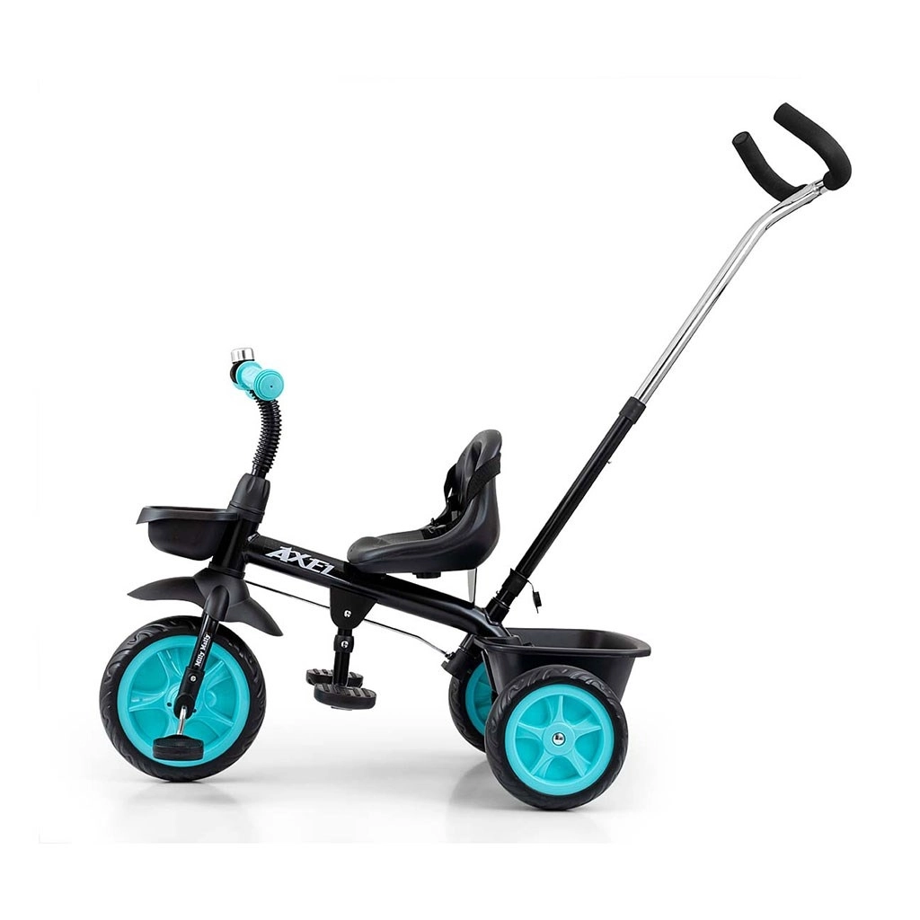 Această tricicletă pentru copii MILLY MALLY AXEL crește odată cu copilul – reglați ușor distanța șezutului față de ghidon și lungimea tijei de ghidare. Construcția metalică durabilă, combinată cu materiale de calitate, garantează o durată lungă de viață și stabilitate. Roțile late din spumă EVA amortizează denivelările și nu necesită întreținere.