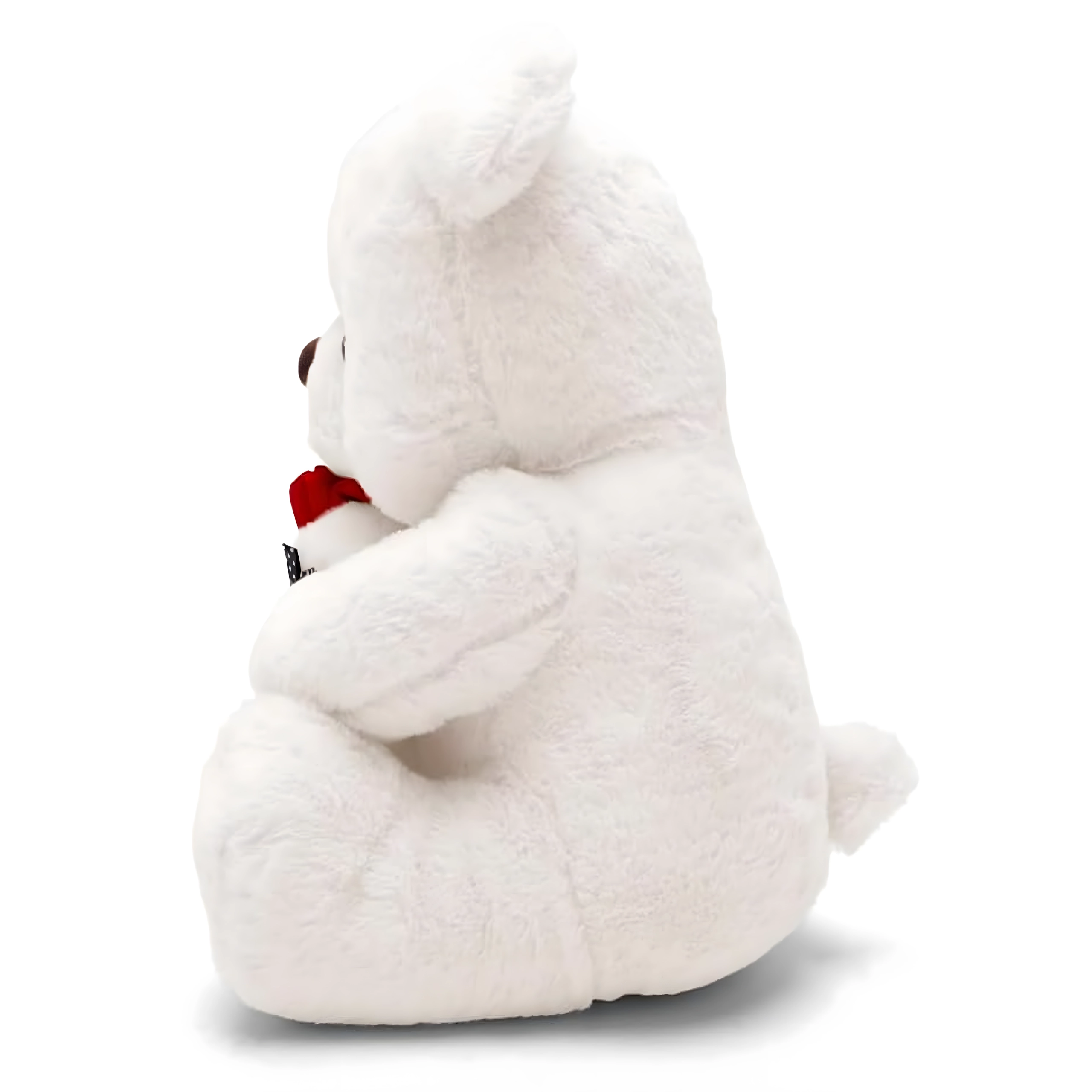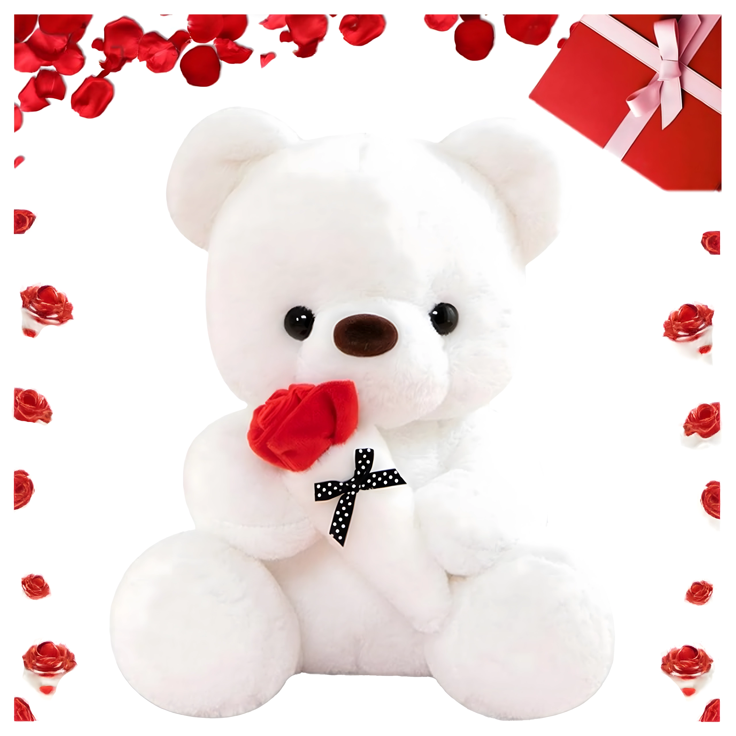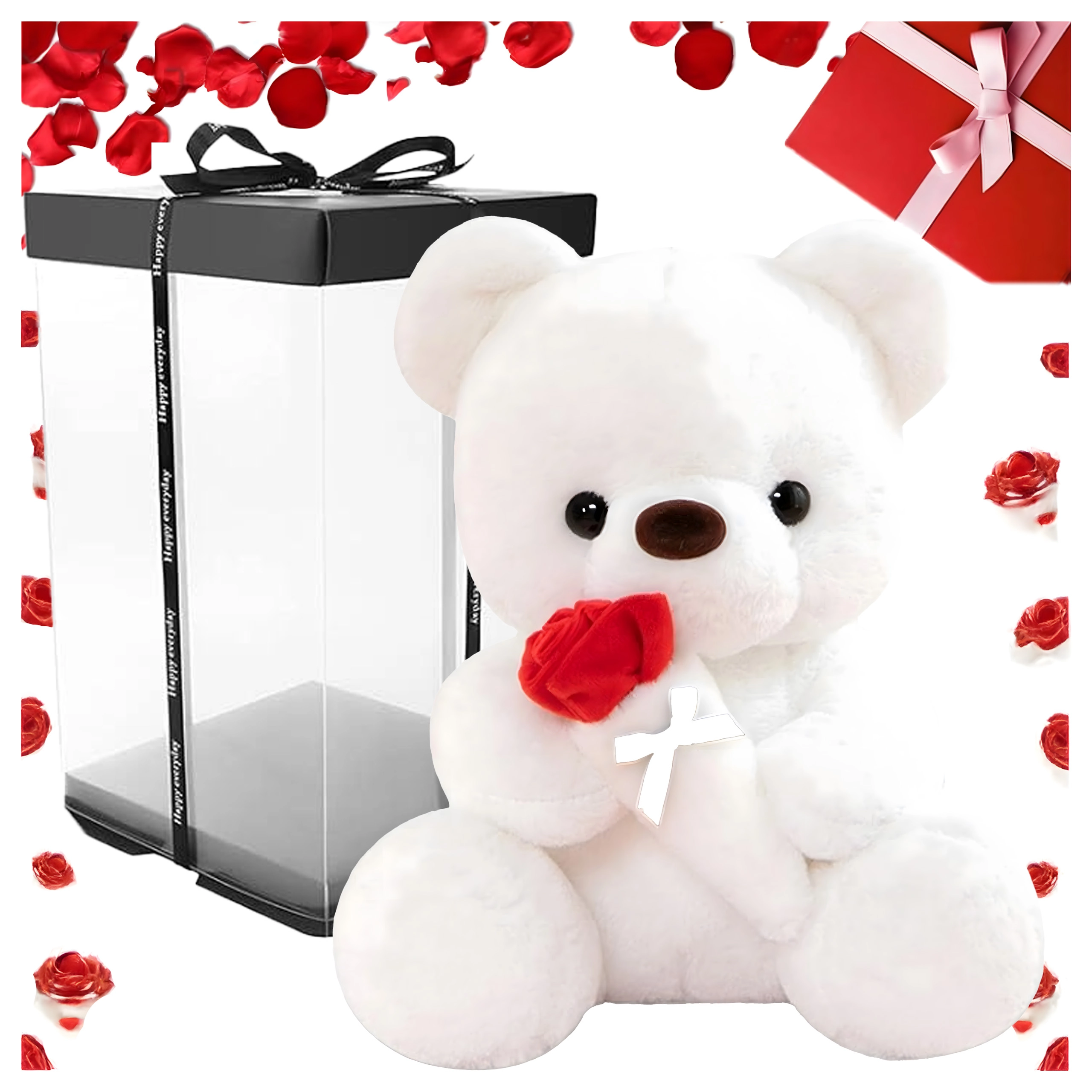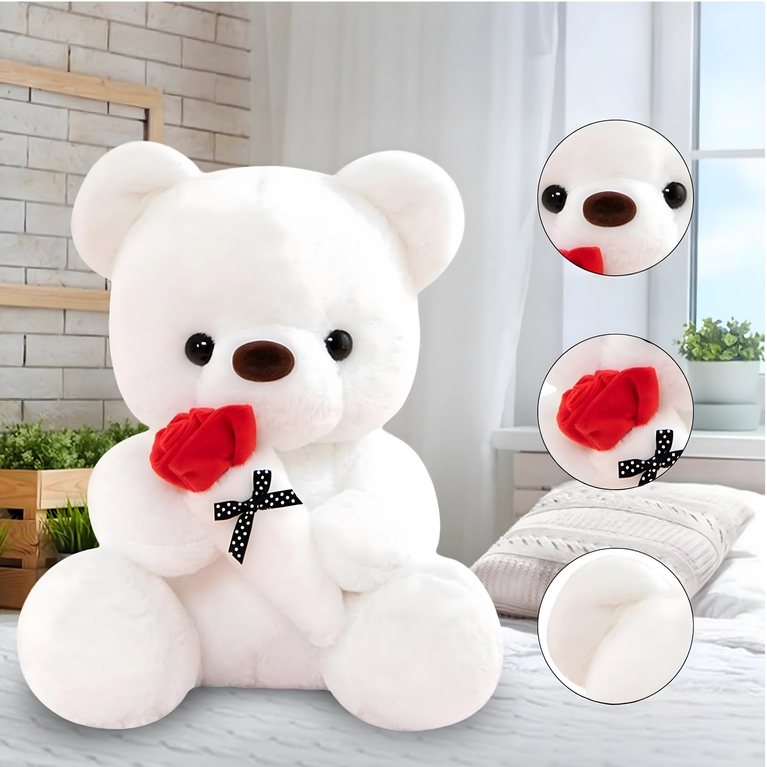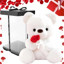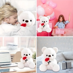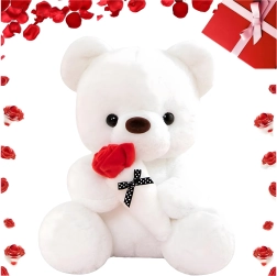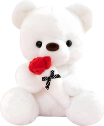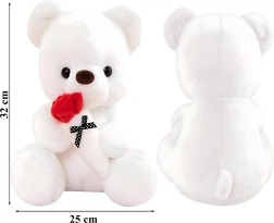 Acest ursuleț de pluș alb atrage atenția de la prima vedere prin finețea, designul adorabil și trandafirul roșu decorativ legat cu o panglică cu buline. Este ideal ca surpriză romantică, dar și ca talisman plăcut pentru camera copilului sau birou.