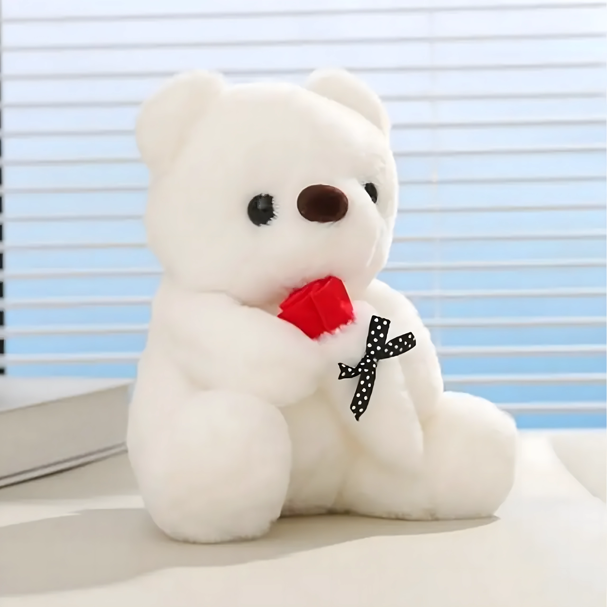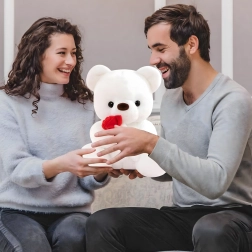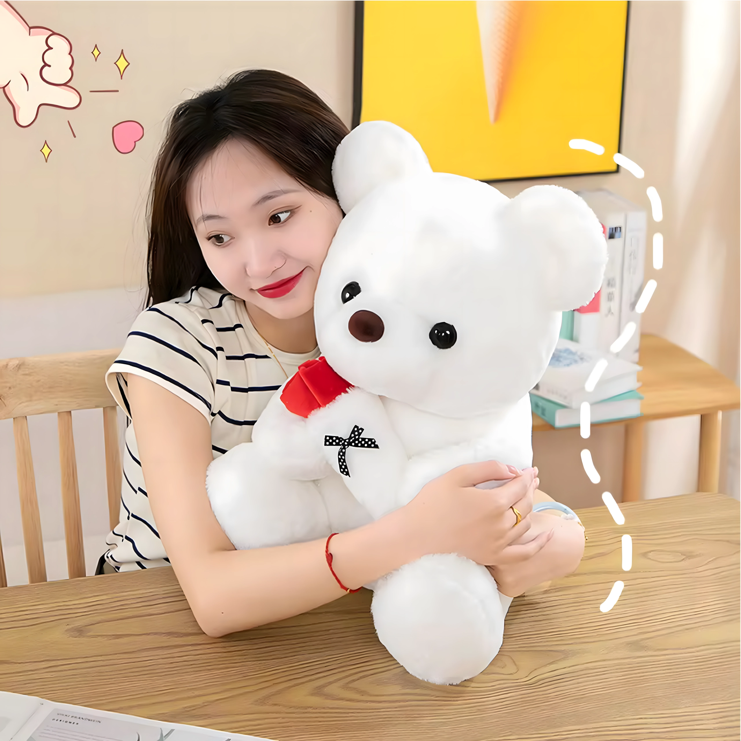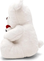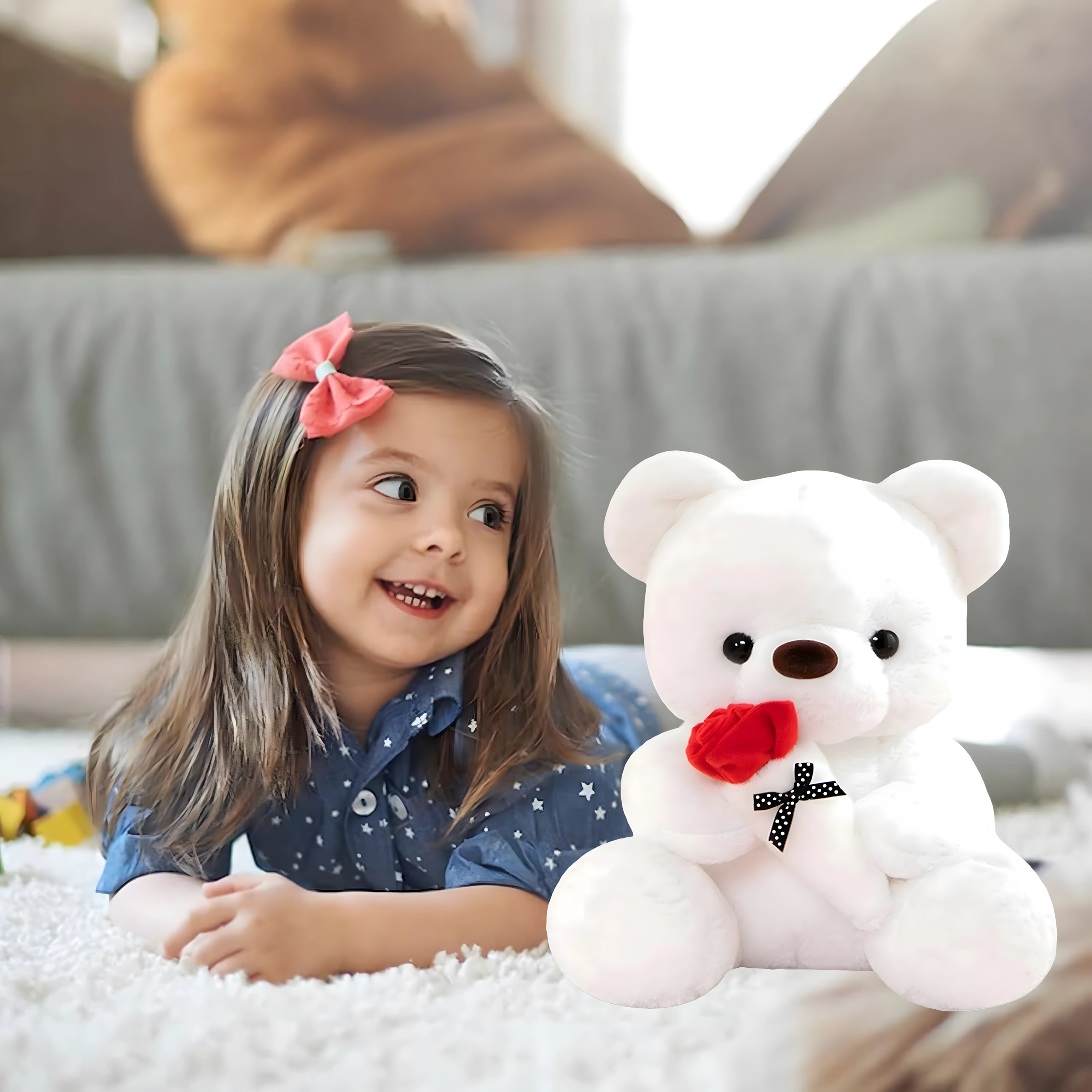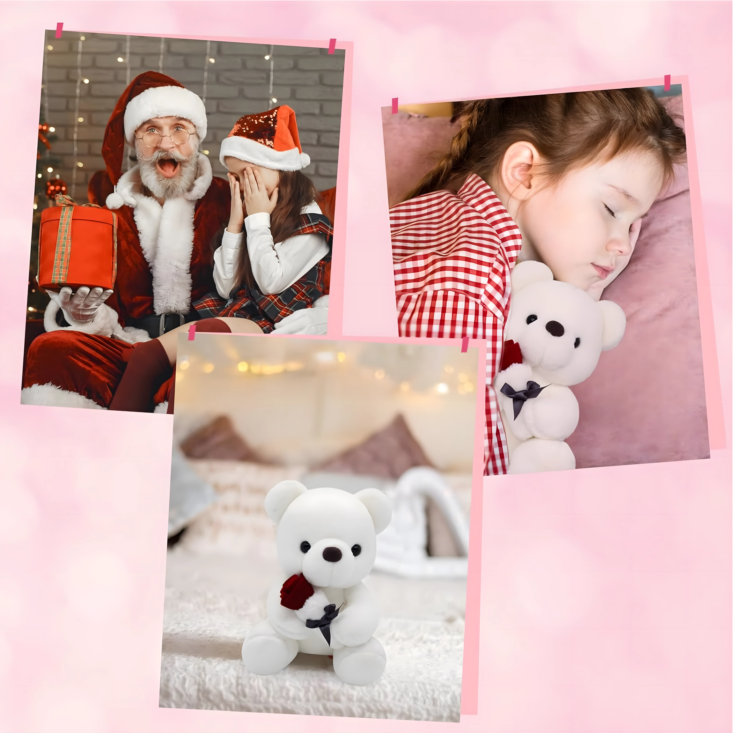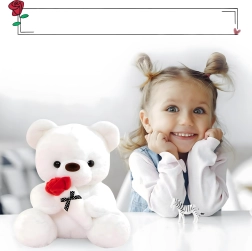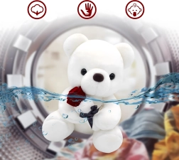 Acest ursuleț de pluș alb atrage atenția de la prima vedere prin finețea, designul adorabil și trandafirul roșu decorativ legat cu o panglică cu buline. Este ideal ca surpriză romantică, dar și ca talisman plăcut pentru camera copilului sau birou.