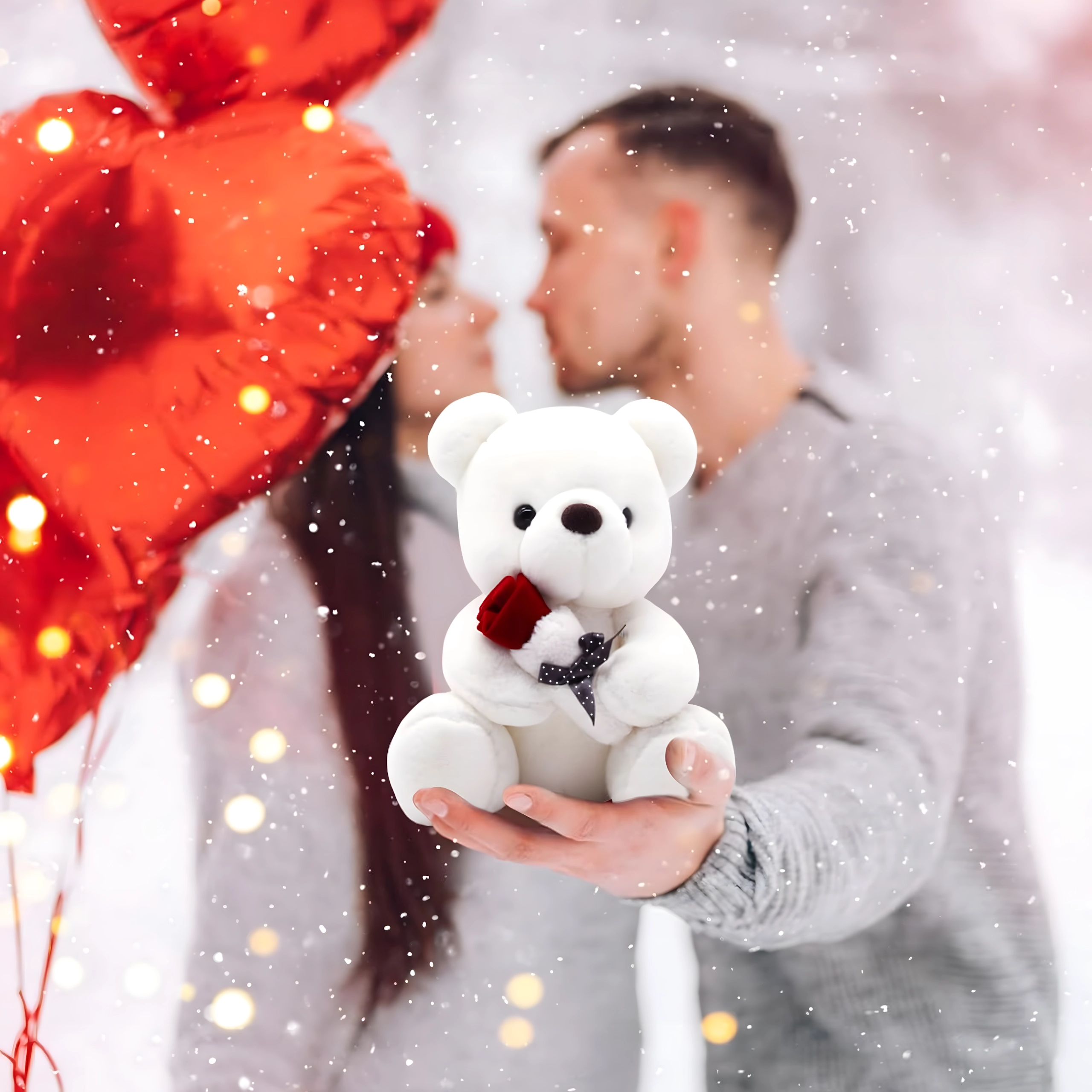 Trandafirul roșu decorativ cu panglică cu buline oferă ursulețului un simbol al dragostei și îl transformă în cadoul perfect pentru Valentine’s Day, aniversări și zile de naștere.