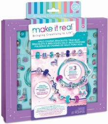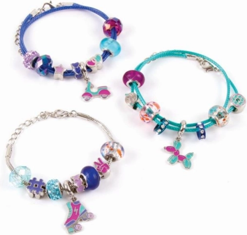 Setul conține material pentru realizarea a trei brățări stilate în tonuri de albastru–mov – ideal pentru a le împărți cu prietenele sau pentru a le purta în straturi.