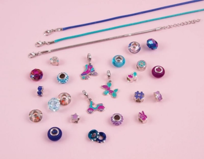 Un mix de mărgele argintii, albastre și mov este completat de pandantive jucăușe, cu care îți creezi un bijou unic, pe măsura ta.