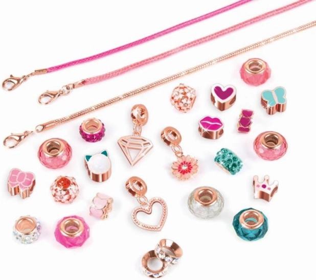 Creează-ți propriile bijuterii cu acest set roz pentru realizarea brățărilor, care conține tot ce ai nevoie: mărgele, pandantive, brățări gata făcute și instrucțiuni. Distracție creativă ideală pentru copii de la 8 ani.