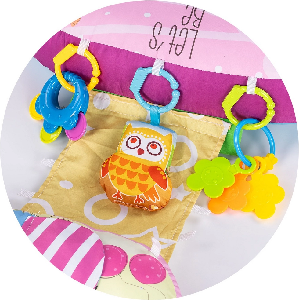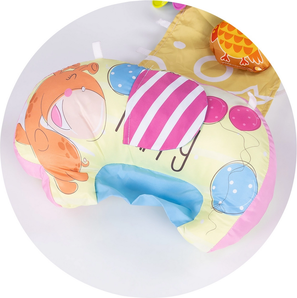 Perna este practică, ușor de întreținut și excelentă pentru tummy time (timp pe burtică), exerciții blânde și primele încercări de stat independent în șezut. Motivele colorate și jucăriile suspendate (la anumite variante) susțin stimularea senzorială și dezvoltarea motricității fine.