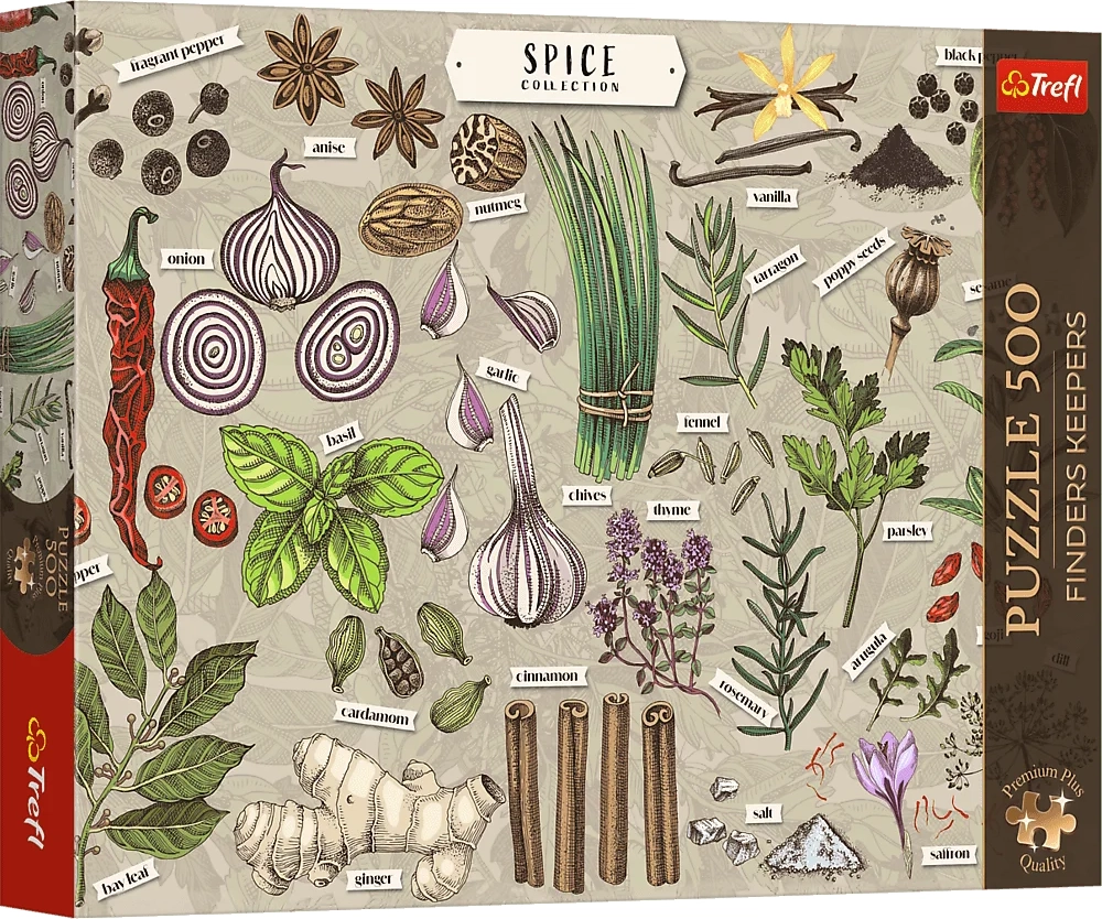 Scufundați-vă în lumea aromelor cu motivul Finders Keepers: Condimente, care amintește de o hartă culturală plină de ierburi, legume și mirodenii. Seria TREFL Premium Plus oferă o execuție precisă, ambalaj modern și imagini atent selectate, care impresionează prin culori și atmosferă.