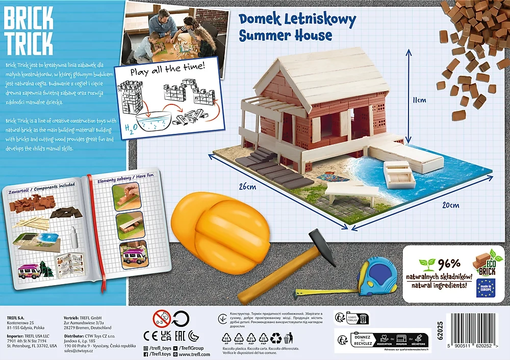 Descoperă lumea creativă a construcțiilor cu setul original Trefl Brick Trick reședință de vară M. Din cărămizi adevărate din lut și scânduri din lemn vei construi o casă pas cu pas, iar datorită adezivului solubil poți construi din nou și din nou. Setul dezvoltă abilitățile manuale, imaginația și concentrarea – distracție ideală pentru micii și marii constructori.