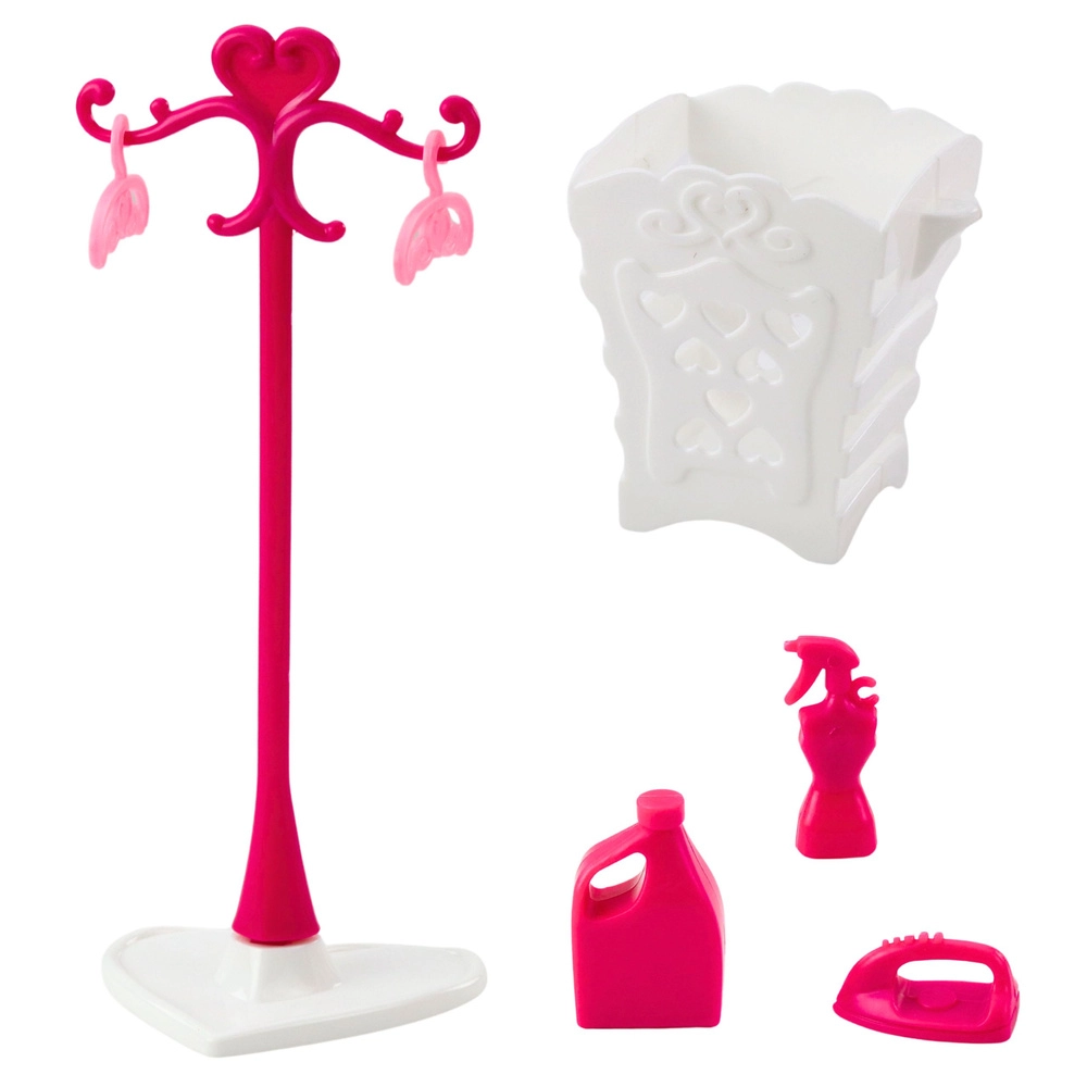 - Accesorii bogate: coș, cuier, umerașe, fier de călcat, sticluțe „de detergent”.