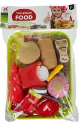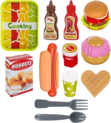- tavă, ketchup, sos de ciocolată, chiflă pentru hot dog, crenvurști, tacâmuri (lingură, cuțit, furculiță), nuggets, dulceață, pahar cu pai, cutie pentru cartofi prăjiți, 5× cartofi prăjiți, 2× chifle pentru burger, vafă, ceapă, salată, roșie, chifteaua, brânză, brioșă, glazură