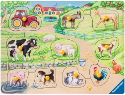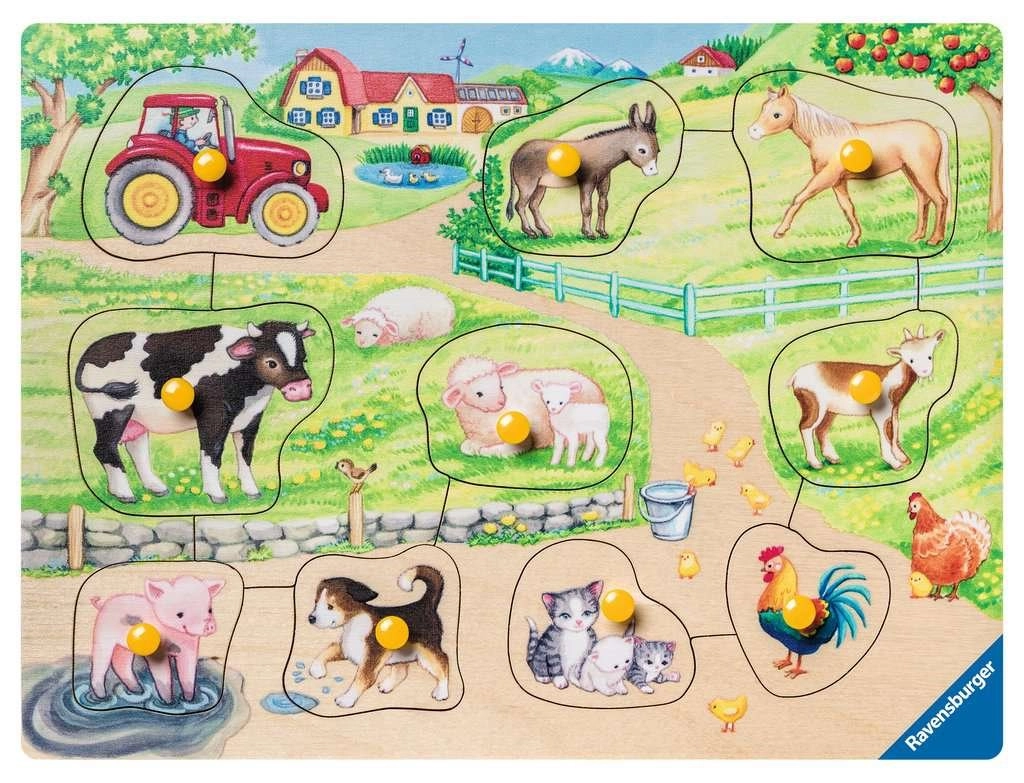 Descoperă puzzle-ul din lemn cu piese de inserat Ravensburger, cu tema Dimineața la fermă, care dezvoltă motricitatea fină, imaginația și percepția spațială a copiilor. Include 10 piese cu ilustrații simpatice ale animalelor domestice și mânere practice pentru prindere ușoară. O alegere ideală pentru copiii de la 2 ani.