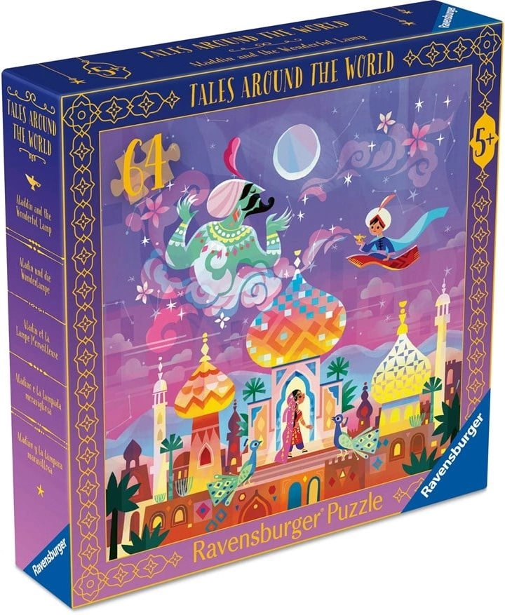 Descoperă magia basmului cu puzzle-ul de calitate RAVENSBURGER, cu motivul ALADIN și lampa fermecată. Ideal pentru copii datorită celor 64 de piese, tăierii precise și dimensiunii de 33,3 × 33,3 cm după asamblare. Perfect pentru dezvoltarea răbdării, motricității fine și concentrării.