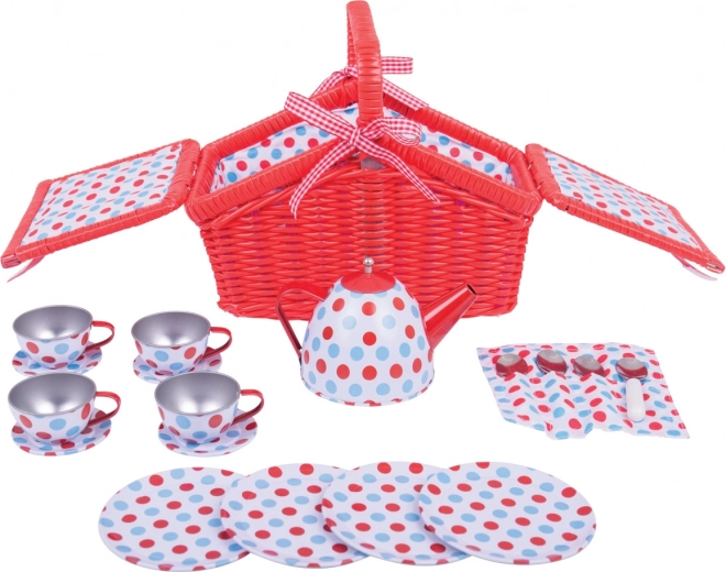 Acest frumos set de ceai este ideal pentru copiii de la 3 ani în sus. Conține tot ce este necesar pentru simularea unei petreceri de ceai, toate acestea într-un coș roșu din răchită, portabil.