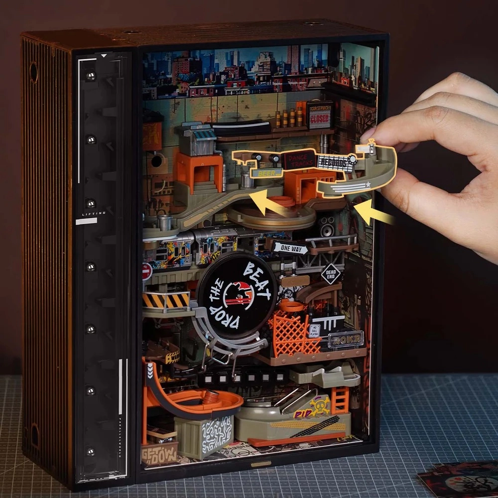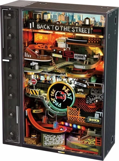 Un peisaj miniatural al unei străzi hip‑hop pulsante aduce mișcarea lină a bilelor pe o pistă de 233 cm, subliniată de iluminarea LED neon dinamică. Datorită motorului eficient cu cuplu ridicat, bilele se întorc fiabil cu ajutorul liftului automat, astfel încât vă bucurați de un spectacol neîntrerupt.