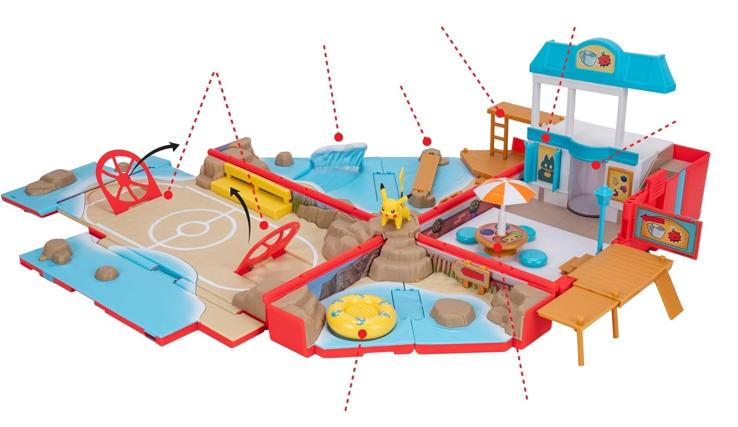 Setul de joc portabil Pokémon Beach Battle de la Jazwares se transformă în câteva clipe dintr-un rucsac compact într-o scenă de plajă detaliată cu promenadă, debarcader și piscină. Include o figurină PIKACHU (aprox. 5 cm), elemente interactive și se transportă ușor în excursii sau la prieteni. Ideal pentru joacă creativă și fanii universului POKÉMON.