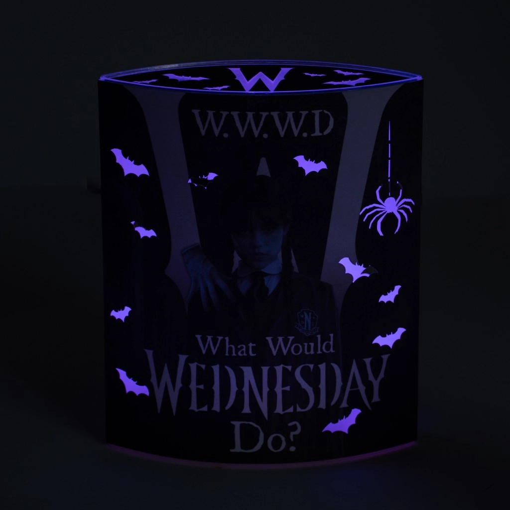 Lampa de design cu motivul Wednesday dansând este accesoriul perfect pentru fanii esteticii gotice și ai serialului WEDNESDAY. Decupajele în formă de lilieci și lumina difuză delicată creează o atmosferă impresionantă în dormitor, living sau birou. Datorită dimensiunilor compacte de 17 × 14 × 6 cm, se potrivește ușor pe noptieră, raft sau birou.