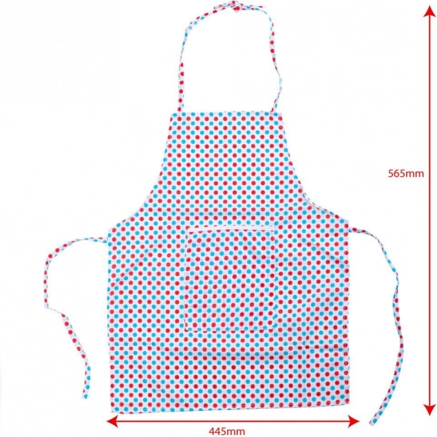 Un șorț plăcut, cu buline colorate, protejează hainele atât la joacă, cât și la coptul real. Boneta reglabilă, cu închidere cu arici, se adaptează ușor circumferinței capului și stă confortabil întreaga zi.