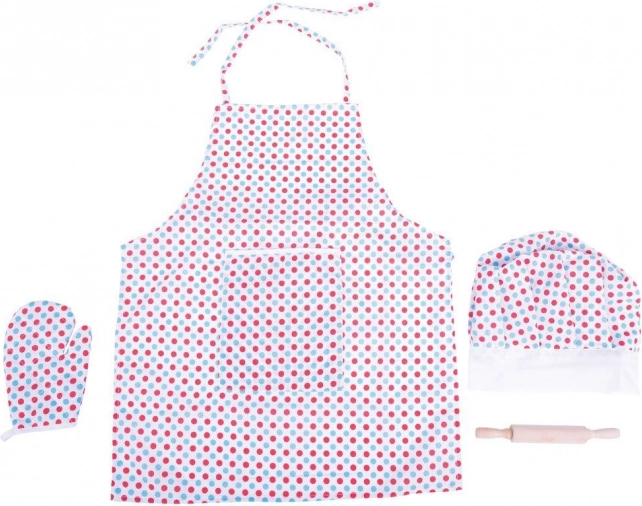 Oferiți micilor bucătari tot ce au nevoie pentru primele încercări de copt și pentru un joc de gătit distractiv. Șorțul textil ușor, cu buline protejează hainele, boneta de bucătar se ajustează ușor datorită ariciului, iar sucitorul din lemn împreună cu formele de tăiat din metal stimulează creativitatea și bucuria de a crea.