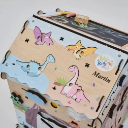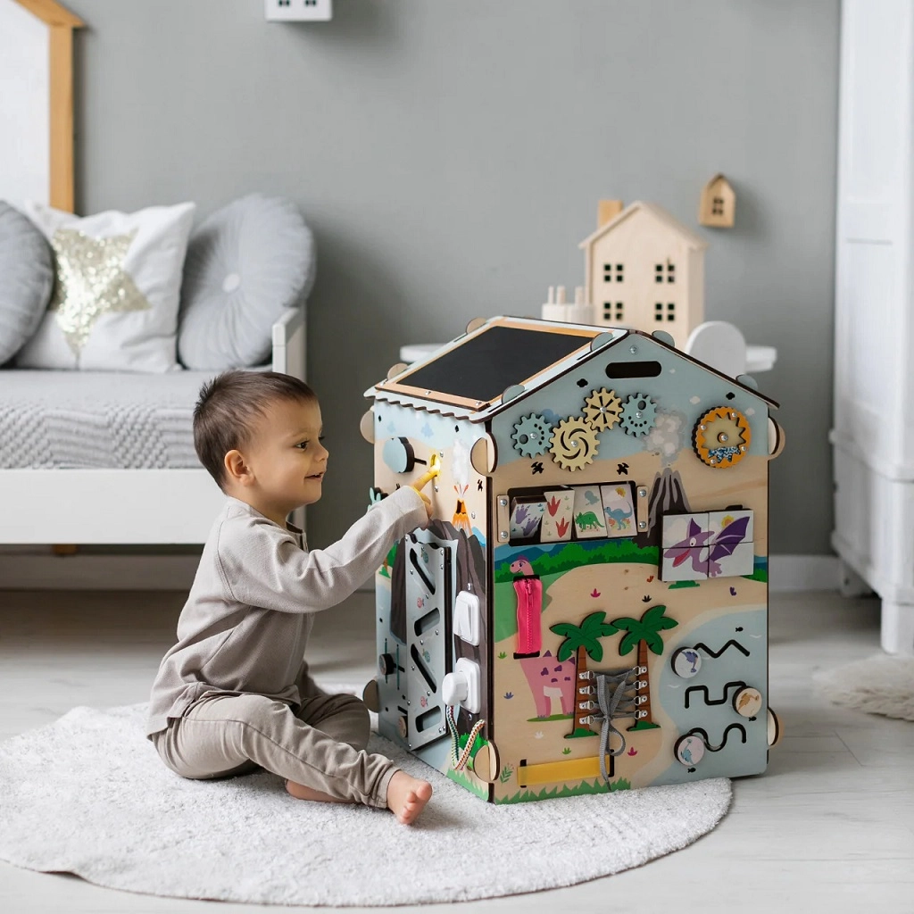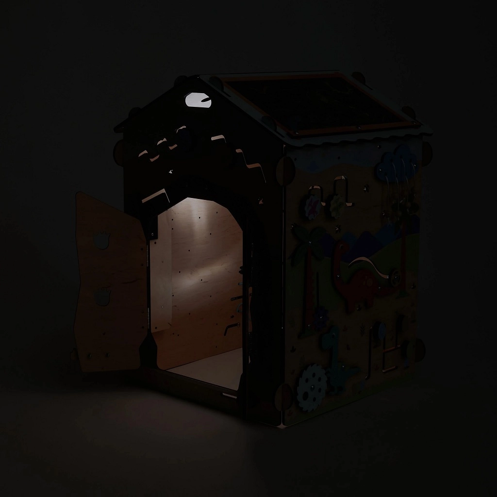 Căsuța activă BusyKids DINO îmbină principiile Montessori cu o gamă bogată de activități care îi conduc în mod natural pe copii către descoperire. Datorită elementelor luminoase, tablei de pe acoperiș și pieselor cu dinozauri, copiii își exersează concentrarea, răbdarea și creativitatea, în timp ce se distrează.