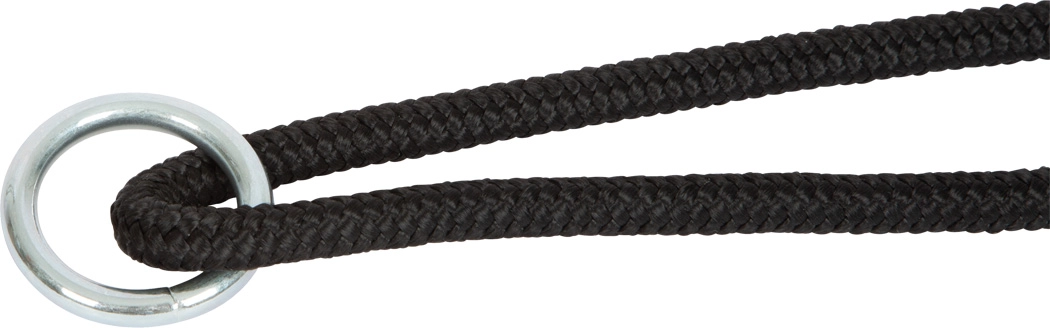 Frânghia neagră rezistentă, cu cursor din plastic și inel metalic, permite agățare și demontare rapidă, precum și reglarea precisă a înălțimii după nevoie.