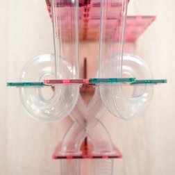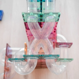 Magneții neodim puternici și piesele pastel transparente permit crearea de turnuri înalte, tuneluri și pâlnii prin care bilele alunecă lin.