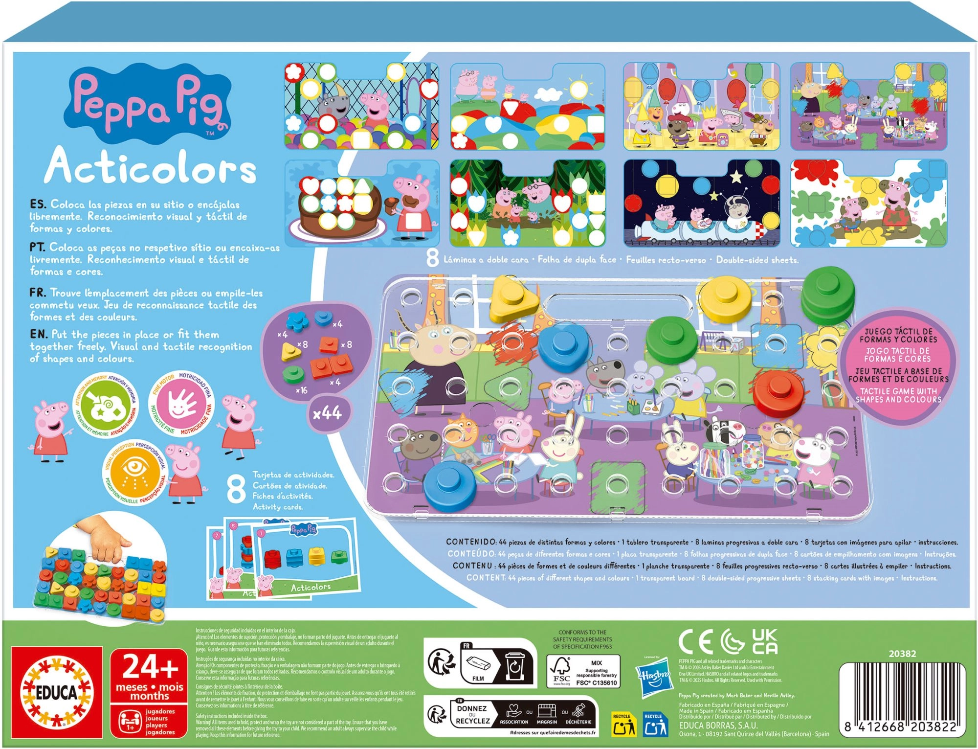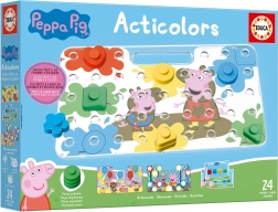Descoperiți lumea culorilor și formelor alături de personajele îndrăgite din PEPPA PIG. Jocul didactic EDUCA Acticolors este conceput pentru cei mai mici, pentru a învăța prin joc – combină piesele după planșe, exersează coordonarea mână–ochi și întărește gândirea logică. Datorită componentelor rezistente și suportului practic cu mâner, joaca este comodă acasă și în călătorii.