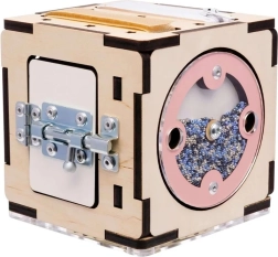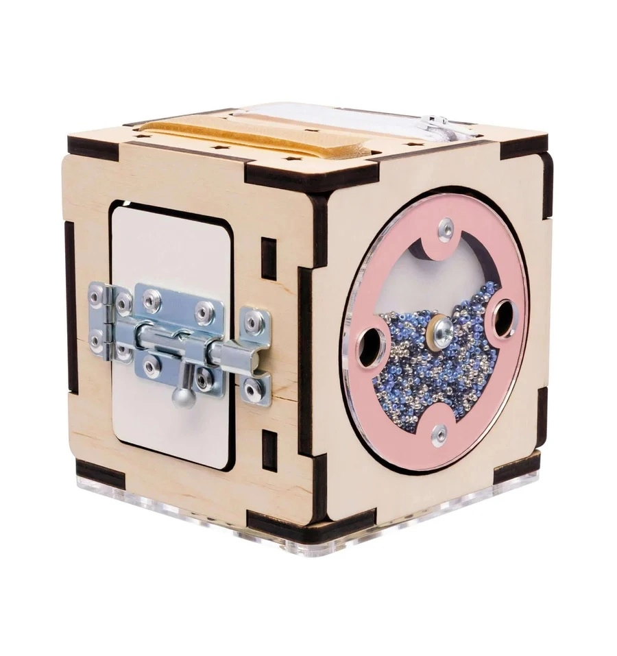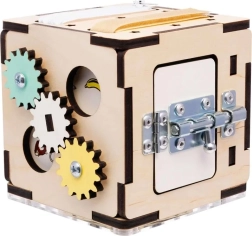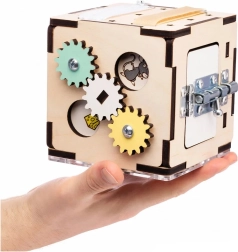Această cutie Montessori este realizată din placaj de mesteacăn de înaltă calitate și finisată cu vopsele sigure pe bază de apă. Marginile rotunjite, construcția solidă și elementele mecanice atent gândite susțin coordonarea mână–ochi, răbdarea și curiozitatea. Datorită dimensiunilor compacte de 11×11×11 cm, copilul o poate lua ușor oriunde.