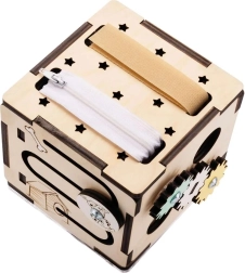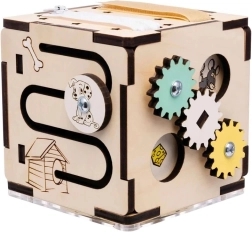 Pe fiecare față veți găsi roți dințate rotative, trasee glisante, fermoar, benzi elastice, ușiță cu zăvor și fereastră cu biluțe pentru explorare senzorială și învățarea relației cauză–efect.