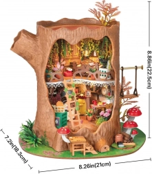 Intrați în lumea fanteziei și creați propria Căsuță din ciot de copac – o mini căsuță pe două etaje cu mobilier din lemn, bucătărie, dormitor, decorațiuni, grădină cu ciuperci și leagăn exterior. După aprinderea luminii LED, modelul se transformă într-o expoziție fermecătoare și devine centrul atenției pe orice raft.