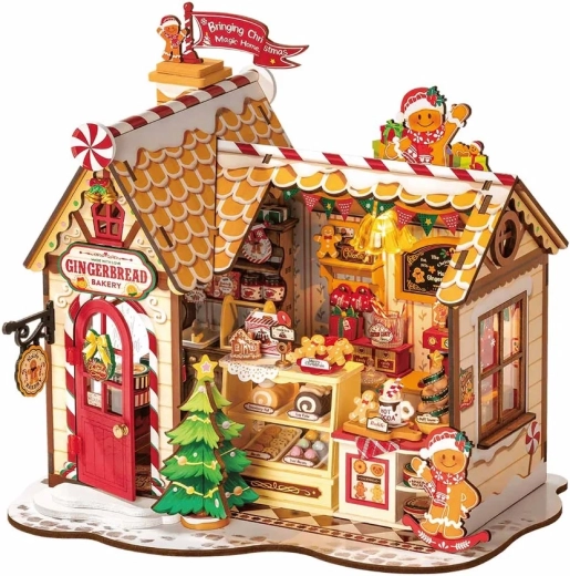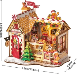 Acest puzzle 3D din lemn, detaliat și bine realizat, aduce atmosfera sărbătorilor în orice interior. Acoperiș mat cu bastonașe de zahăr, ușă roșie, vitrine pline de delicii și lumină LED caldă creează o miniatură unică, ideală pentru raft sau pervaz. Asamblarea nu necesită lipici sau unelte – piesele se îmbină perfect, iar modelul final este stabil.