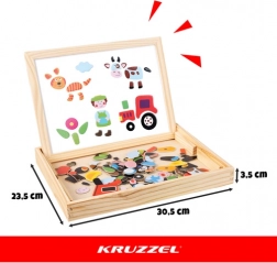 Tabla dublă creativă KRUZZEL pentru copii de la 3 ani îmbină o suprafață albă magnetică pentru aranjarea formelor și scriere cu marker cu o parte neagră pentru cretă destinată desenului. Pachetul include 108 piese magnetice colorate, marker dry-erase, cretă, burete și o practică cutie din lemn pentru depozitare. O unealtă grozavă pentru dezvoltarea motricității fine, gândirii logice și creativității fără ecrane.