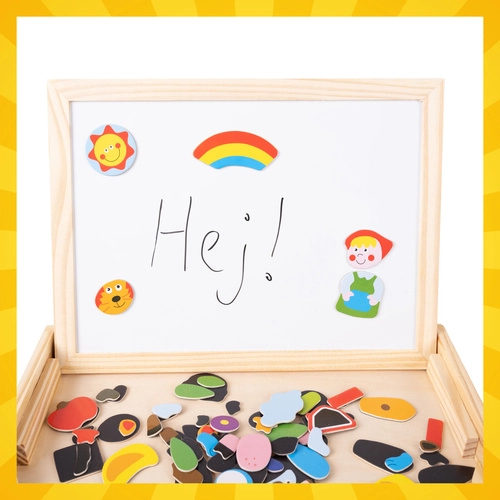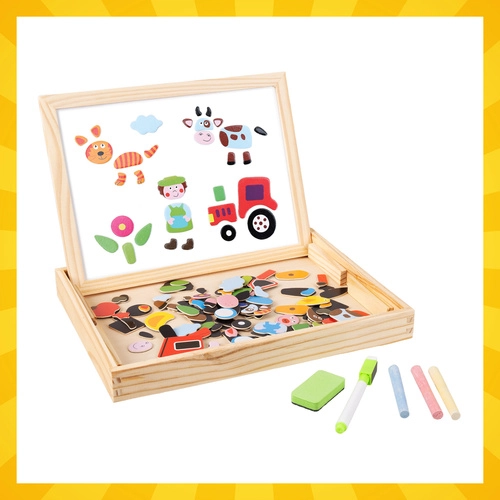 Descoperiți o jucărie inteligentă care crește odată cu copilul. Tablă dublă care oferă două lumi ale distracției – fața albă magnetică pentru aranjarea animalelor, personajelor și vehiculelor și pentru scriere cu marker dry-erase, iar partea neagră pentru cretă destinată desenului liber. Totul este păstrat într-o cutie compactă din lemn, care servește și ca suport.