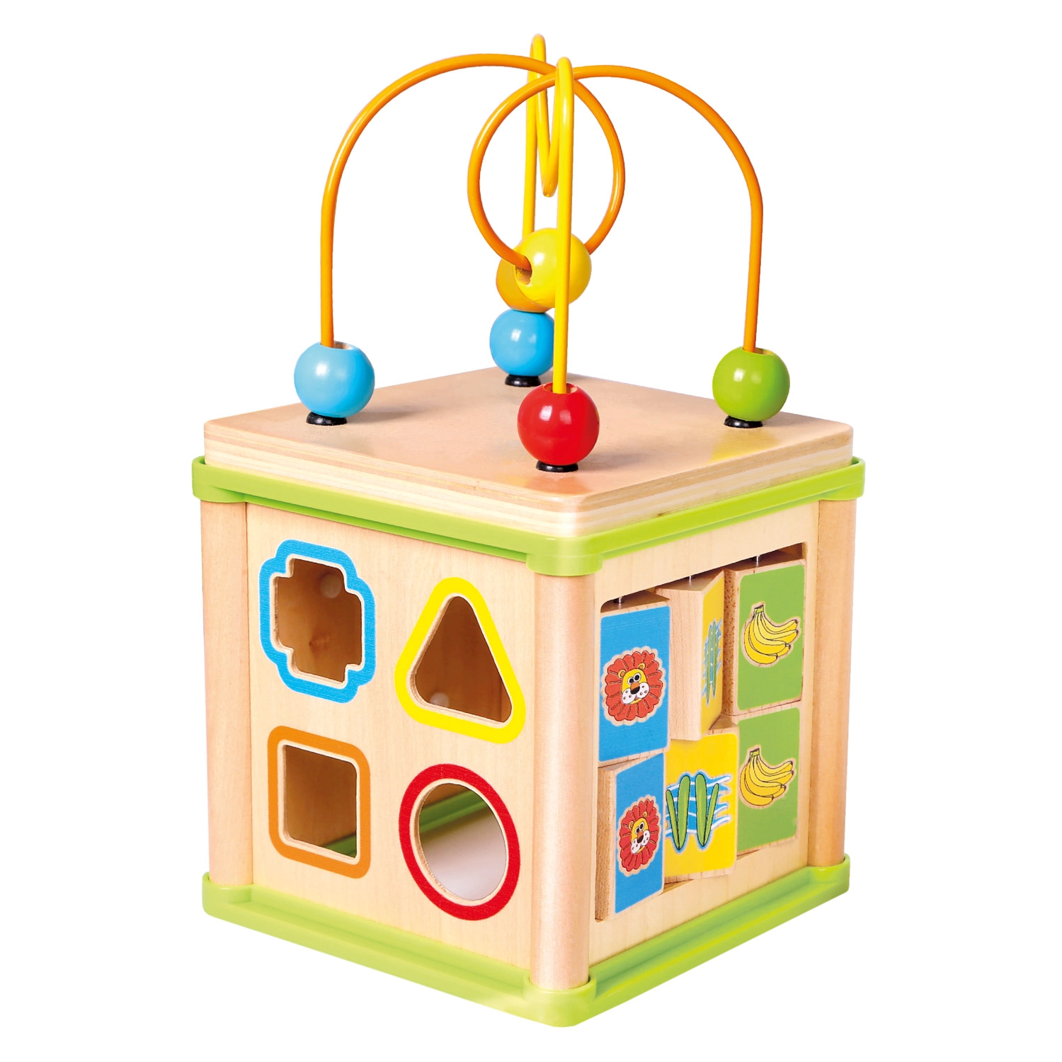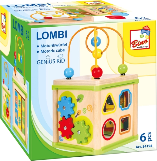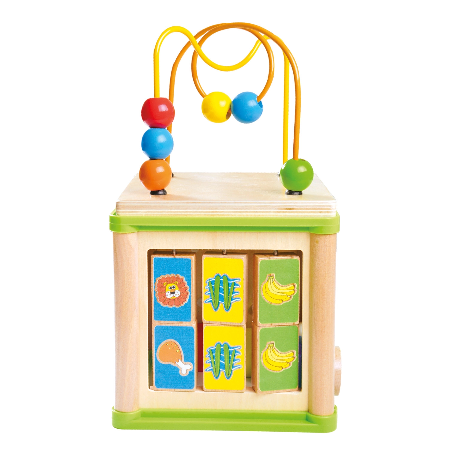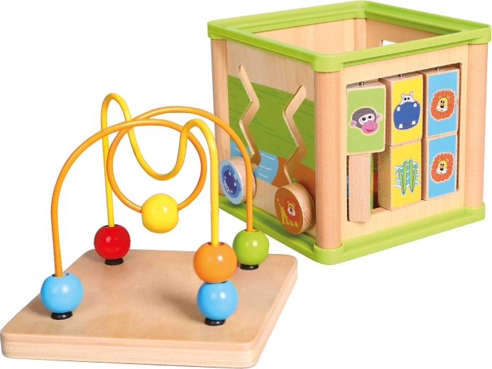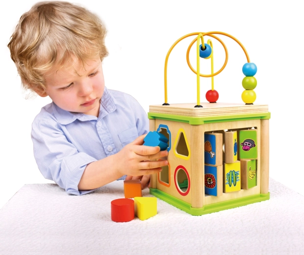 Acest cub activ versatil din lemn combină cinci elemente de joc atractive într-un format compact. Copiii pot asocia animalele cu hrana lor, pot ghida mărgelele pe trasee șerpuite, pot explora funcția rotițelor dințate sau pot exersa sortatorul de forme. Partea superioară este un labirint cu mărgele, care susține coordonarea mână–ochi și concentrarea.