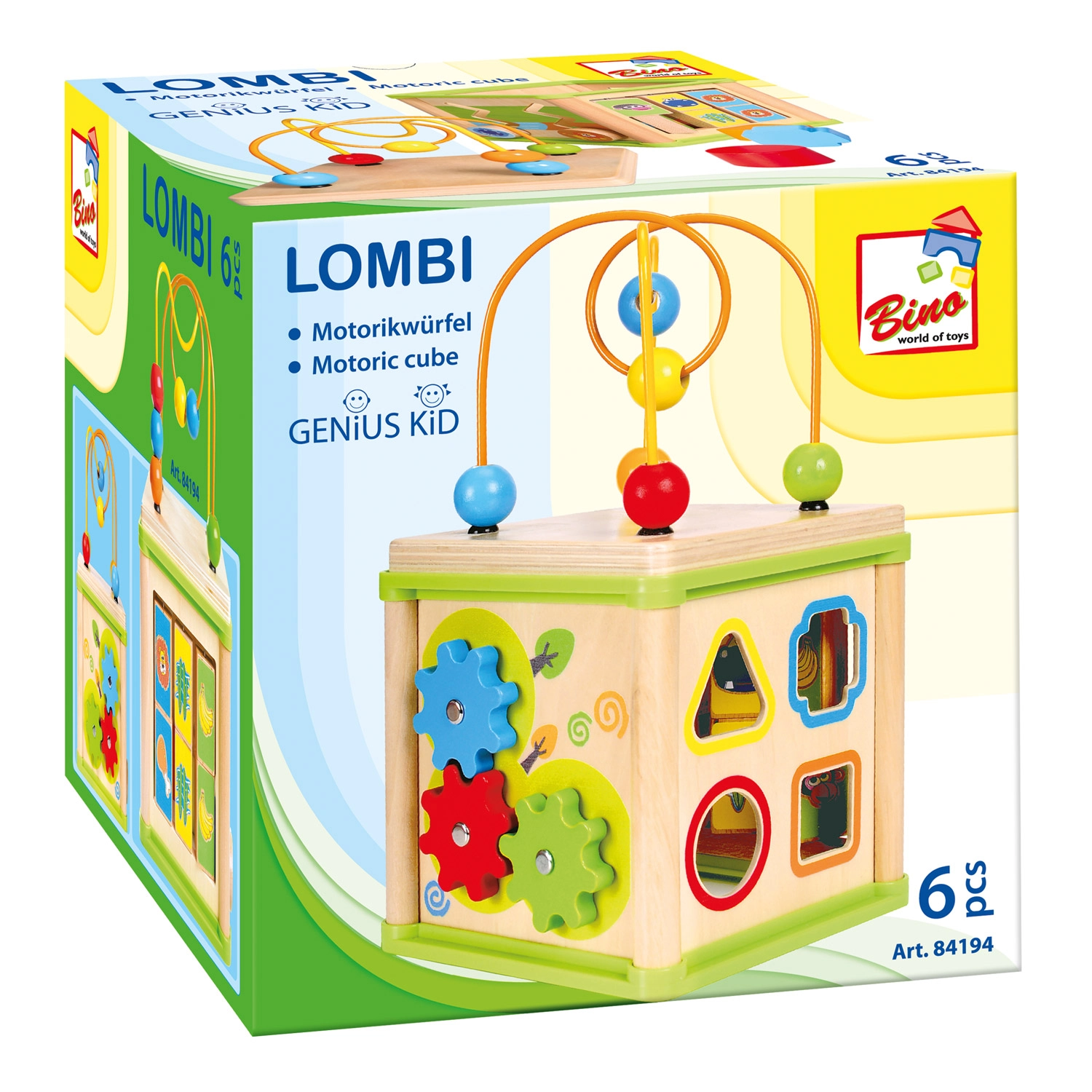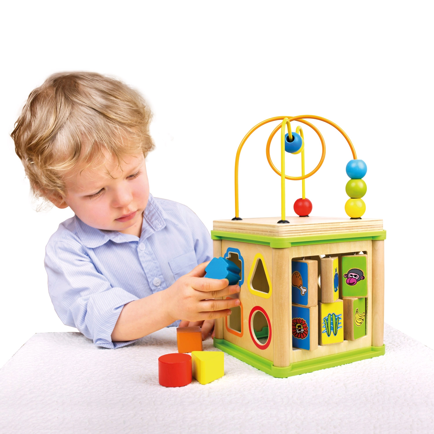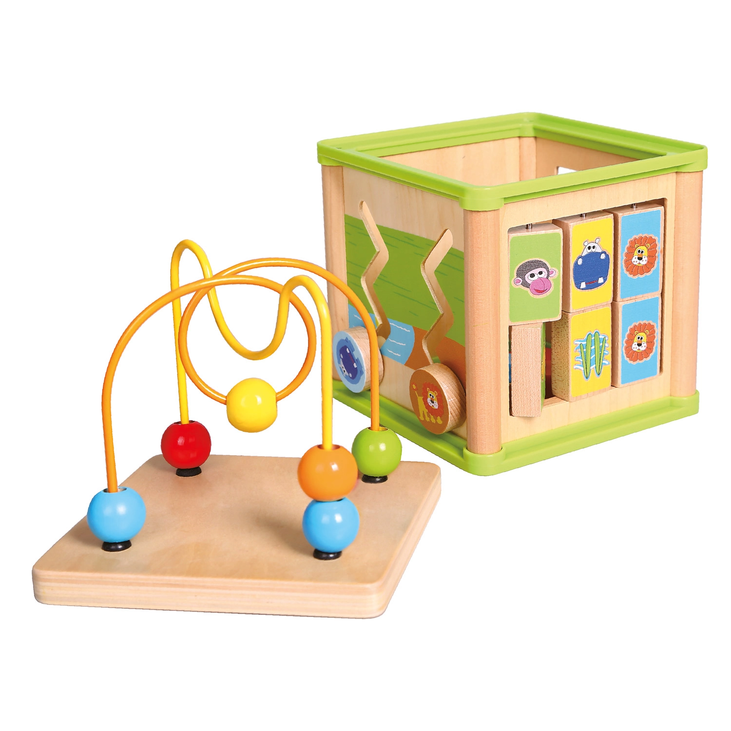 Acest cub activ versatil din lemn combină cinci elemente de joc atractive într-un format compact. Copiii pot asocia animalele cu hrana lor, pot ghida mărgelele pe trasee șerpuite, pot explora funcția rotițelor dințate sau pot exersa sortatorul de forme. Partea superioară este un labirint cu mărgele, care susține coordonarea mână–ochi și concentrarea.