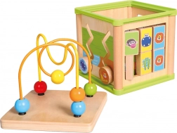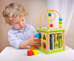 Acest cub motric multifuncțional îmbină cinci activități îndrăgite: sortator de forme, angrenaje cu roți dințate, trasee șerpuite cu piese glisante, asocierea animalelor cu hrana lor și labirintul cu mărgele de pe partea superioară. Fiecare latură a cubului este concepută pentru a stimula coordonarea mână–ochi, răbdarea și concentrarea.