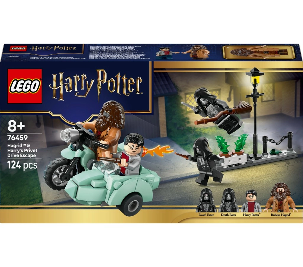 Acest set redă fidel evadarea dramatică de sub ochii Devoratorilor Morții: Hagrid ține ghidonul motocicletei sale verde deschis, în timp ce Harry stă în siguranță în atașul spațios. Aspectul autentic este completat de farul transparent, anvelopele robuste și mini-scena întunecată a Aleii Primrose cu lampă, gard și ghiveci de flori care poate fi răsturnat în timpul jocului.
