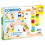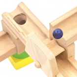 Setul conține 40 de piese, dintre care 34 formează pista și 6 sunt bile din sticlă. Piesele din lemn masiv în culori naturale și vii oferă un farmec vizual jocului și îi ajută pe copii să își exerseze concentrarea și îndemânarea.
