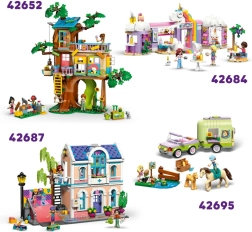 Sunt incluse minifigurinele Liann, Aliya și instructoarea Cindy, caii Coco și Thunder, plus două pisici și un cățel. Nu lipsesc accesoriile precum roaba pentru fân, lăzi pentru hrană, obstacole, trofee și o tablă pentru lecții, care susțin jocul creativ deschis.