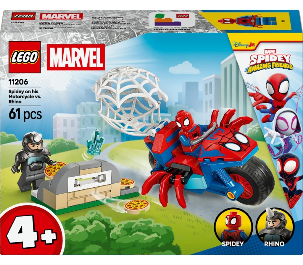 Această construcție colorată aduce urmăriri pline de acțiune și momente amuzante – Spidey pe motocicleta roșu-albastră cu detalii de păianjen îl urmărește pe Rhino, care trage felii de pizza zburătoare din propriul cuptor. Copiii se vor bucura de construcție ușoară, de multe accesorii și de posibilitatea de a prinde pe Rhino în pânză.