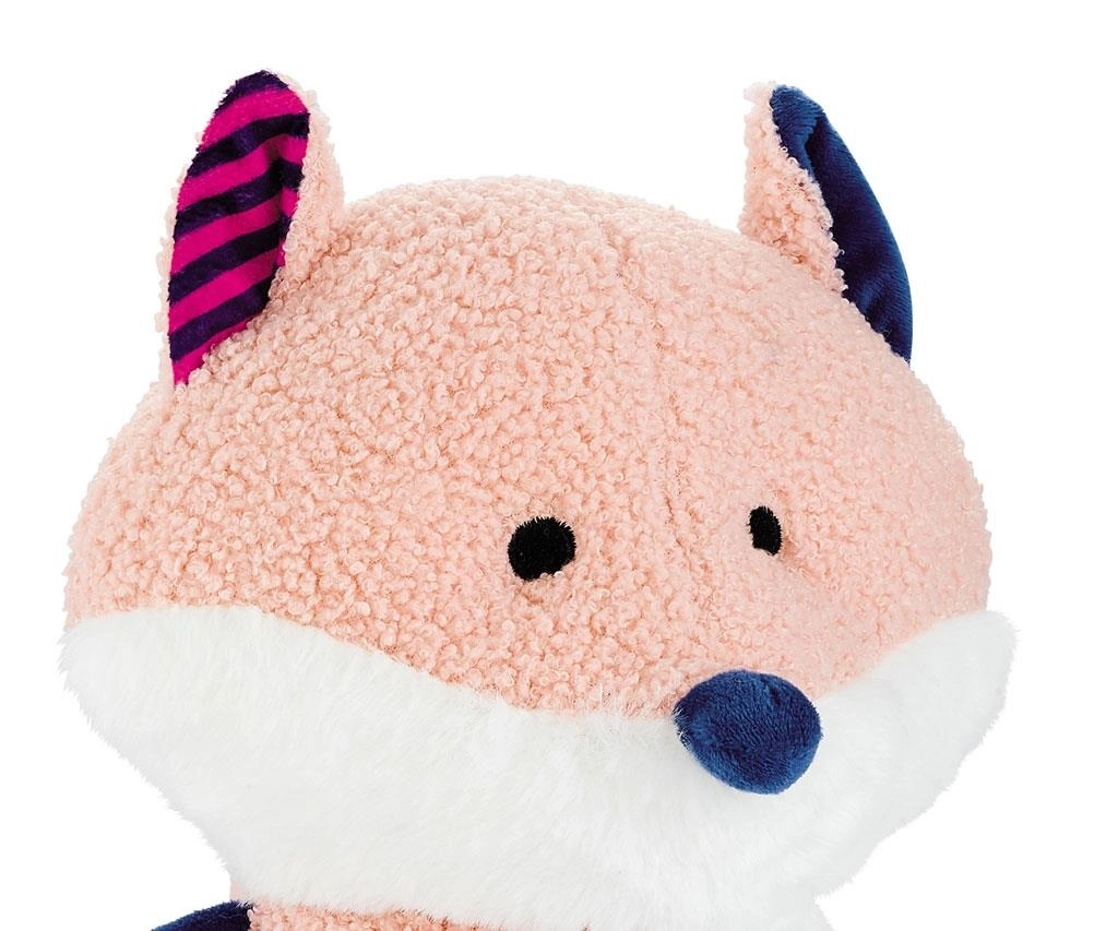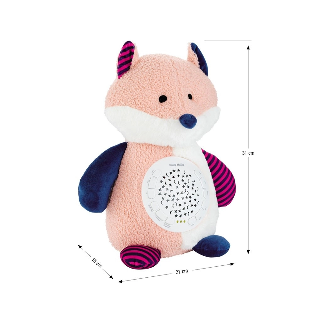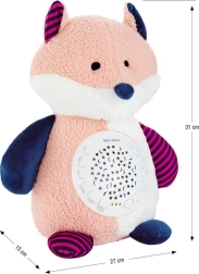 O vulpe de pluș adorabilă, cu proiector detașabil, transformă camera copilului într-un cer înstelat și ajută bebelușul să adoarmă liniștit. Oferă 10 cântece de leagăn, 5 sunete de zgomot alb, 7 moduri de iluminare color, temporizator 30/60/90 min și 5 niveluri de volum. Material catifelat și execuție sigură pentru 0+ luni.