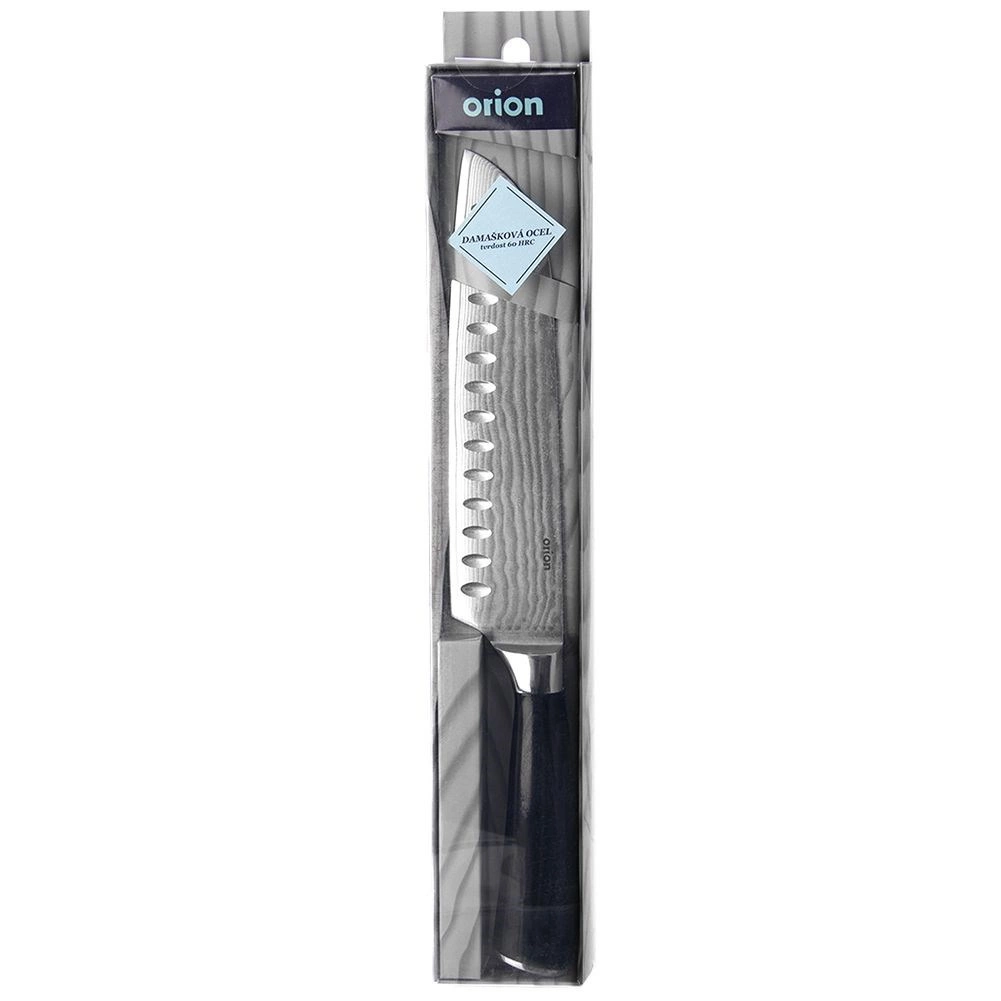 Cuțit de bucătărie santoku de precizie, cu lungime totală de 31 cm și lamă de 18 cm din oțel damasc cu 67 de straturi pentru ascuțime și durabilitate excepționale. Mânerul ergonomic din lemn pakka se potrivește perfect în mână, iar canalele granton de pe lamă minimizează aderența alimentelor. Ideal pentru tăiere, tocare și feliere de fructe, legume și carne, atât în bucătăria de acasă, cât și în cea profesională.