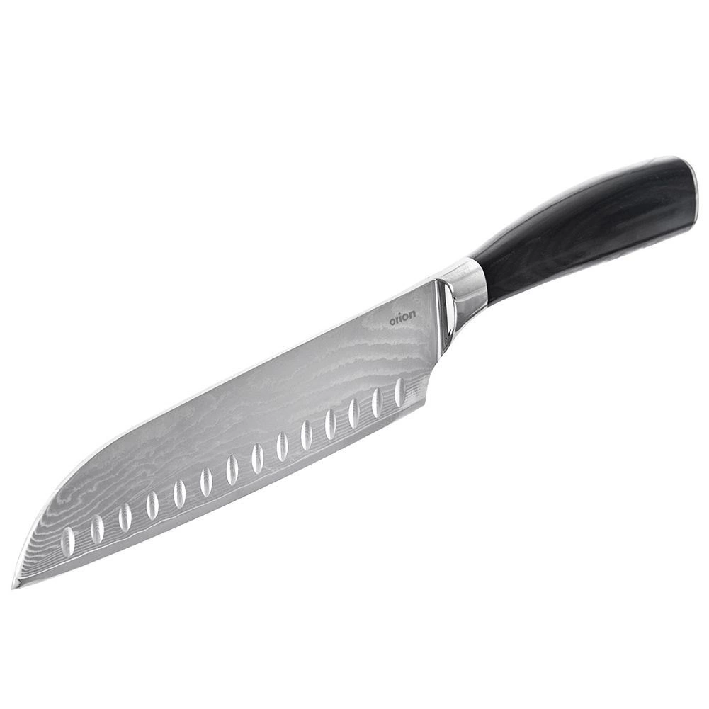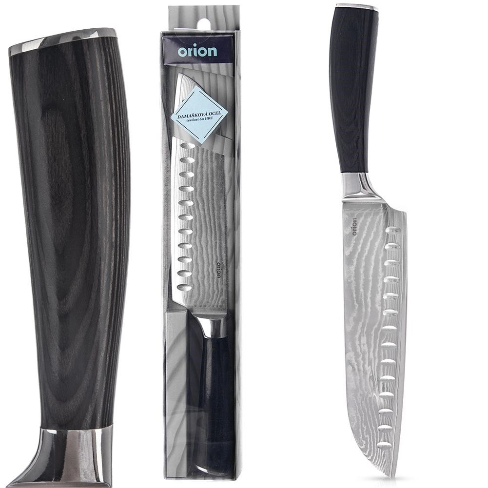 Cuțitul santoku îmbină inspirația japoneză cu standardele europene de fabricație. Oțelul damasc cu 67 de straturi oferă duritate remarcabilă, rezistență și ascuțime de lungă durată, în timp ce profilul plat al lamei facilitează tăieturi precise și pregătirea rapidă a ingredientelor. Datorită cavităților granton, feliile nu se lipesc de lamă, iar tăierea este cursivă.
