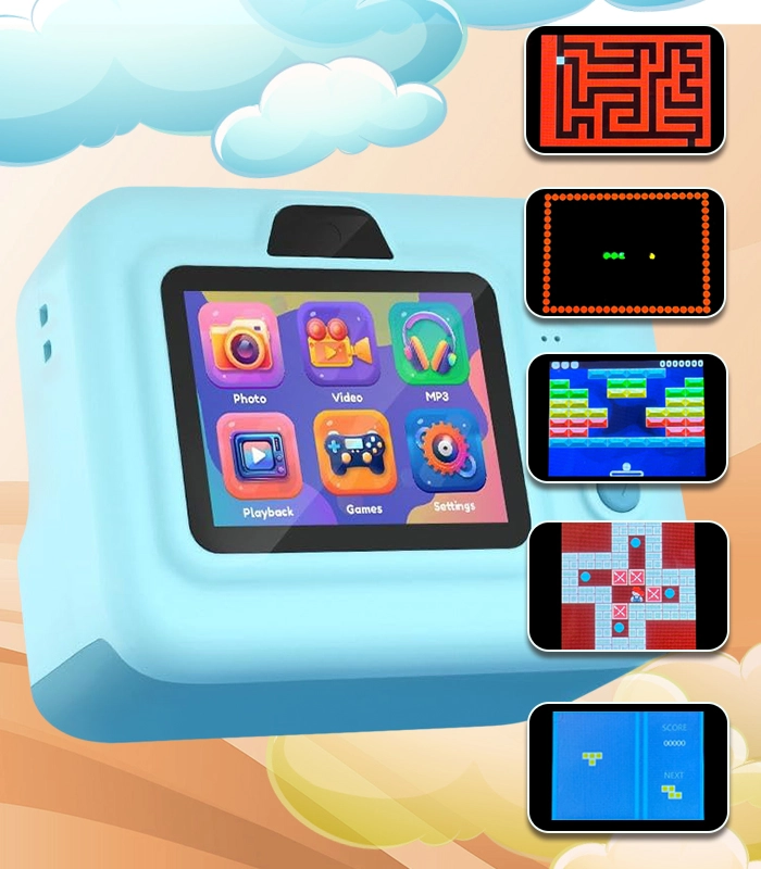 Aparatul combină fotografierea, video 1080P și mini-jocuri (puzzle, șarpe, pinball, sokoban) pentru distracție și dezvoltarea creativității. Ecranul clar de 2,4" și controlul intuitiv îi ajută pe copii să vizualizeze și să lucreze ușor cu fotografiile și videoclipurile. Suportul pentru carduri de memorie microSD până la 32 GB oferă suficient spațiu pentru amintiri.