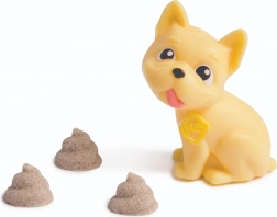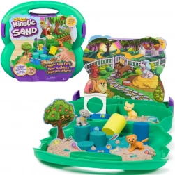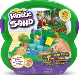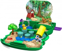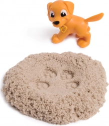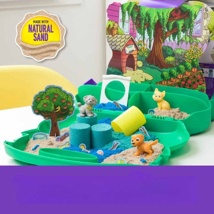 Sunt incluse trei culori de nisip (natural, negru și verde), 3 figurine de căței, rolă–formă, unealtă de modelare și decoruri de parc din carton. Copiii pot amesteca culorile, crea urme de lăbuțe, tuneluri și poteci, dezvoltându-și imaginația și motricitatea fină.