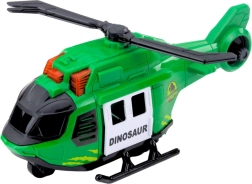 Elicopterul verde cu rotoare rotative completează poveștile cu căutarea și transportul dinozaurilor.