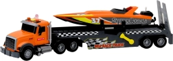 Camionul portocaliu detaliat, cu remorcă și rampă de încărcare, permite încărcarea ușoară a bărcii și un transport fidel până la curse.