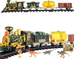 - locomotivă, vagon de pasageri, cisternă, vagon de marfă, șine drepte, șine curbe, telecomandă RC 27 MHz, figurine dinozauri, indicatoare rutiere, autocolante, copăcei